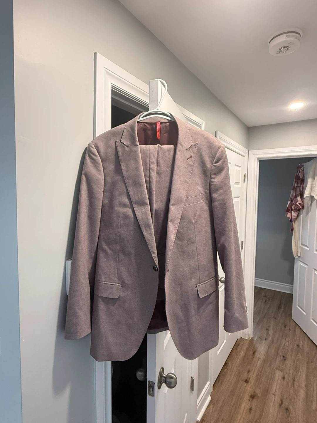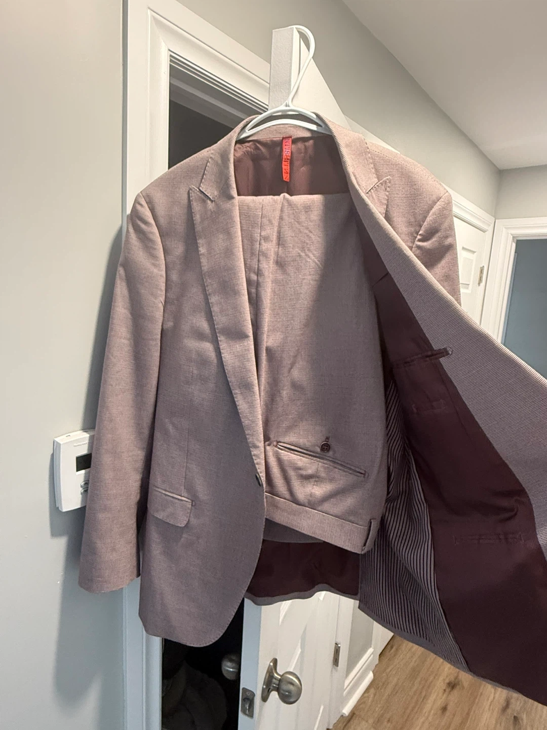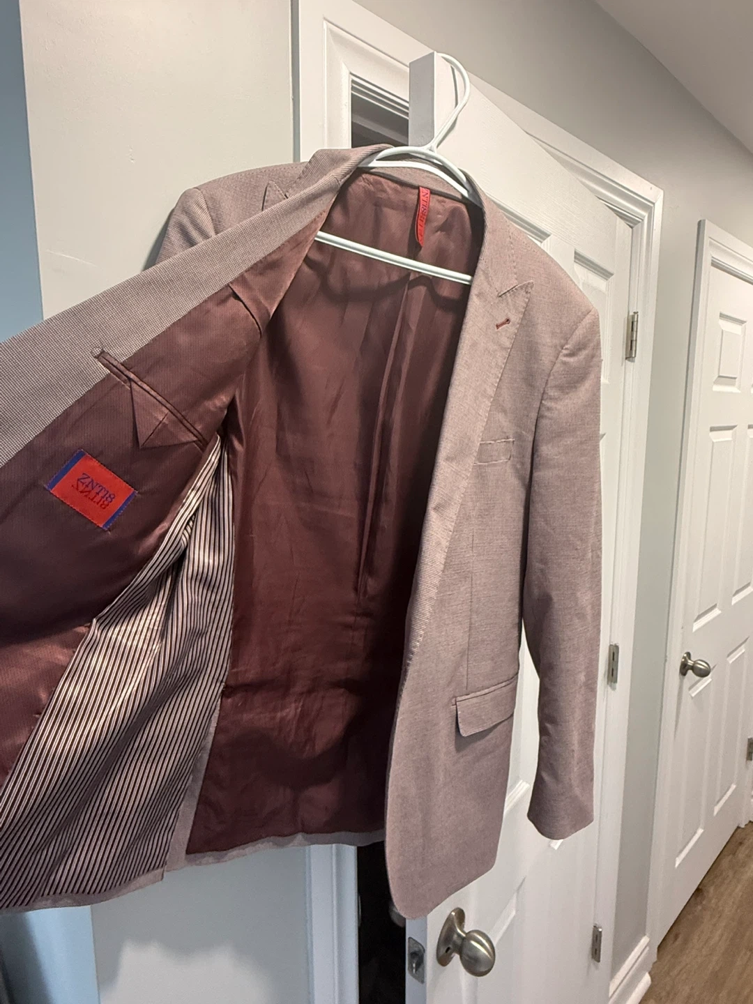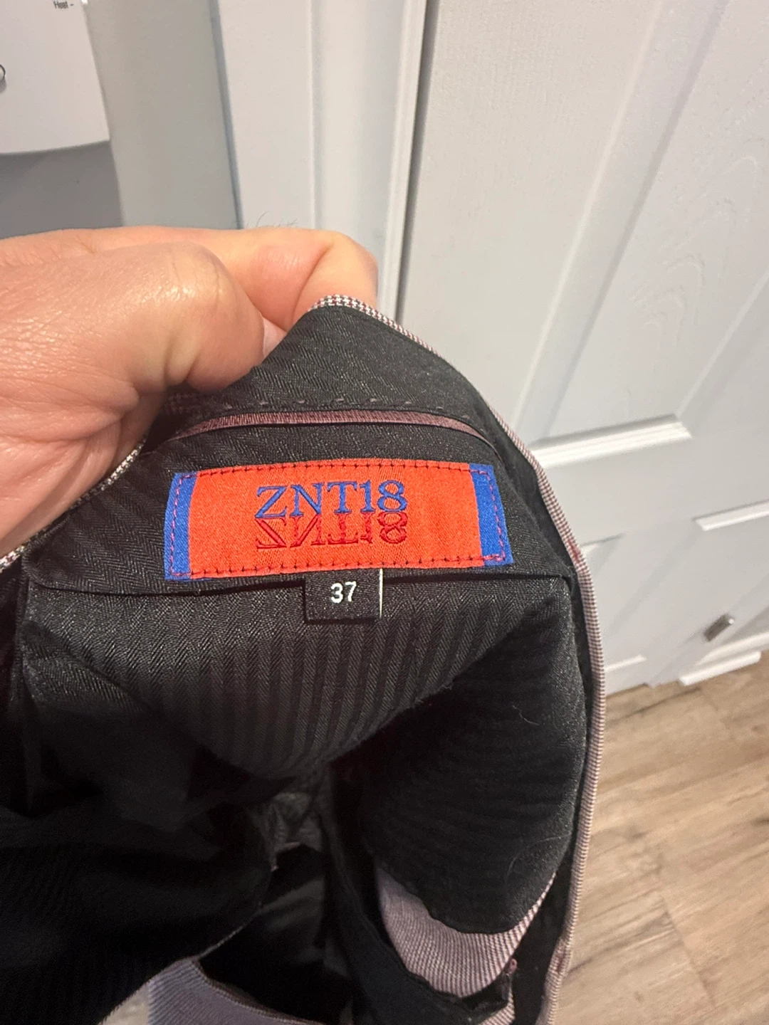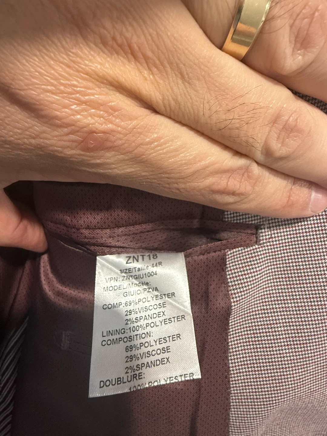 This is a ZNT18 men's suit. The suit is a size 44R. It's made of 69% polyester, 29% viscose, and 2% spandex. The lining is 100% polyester.