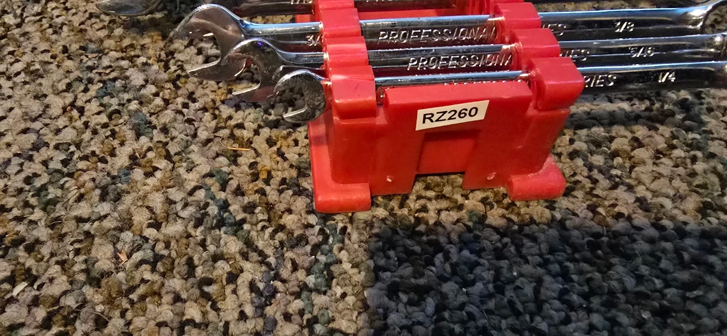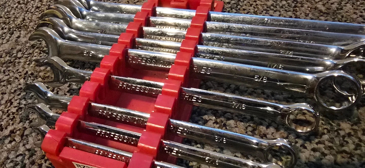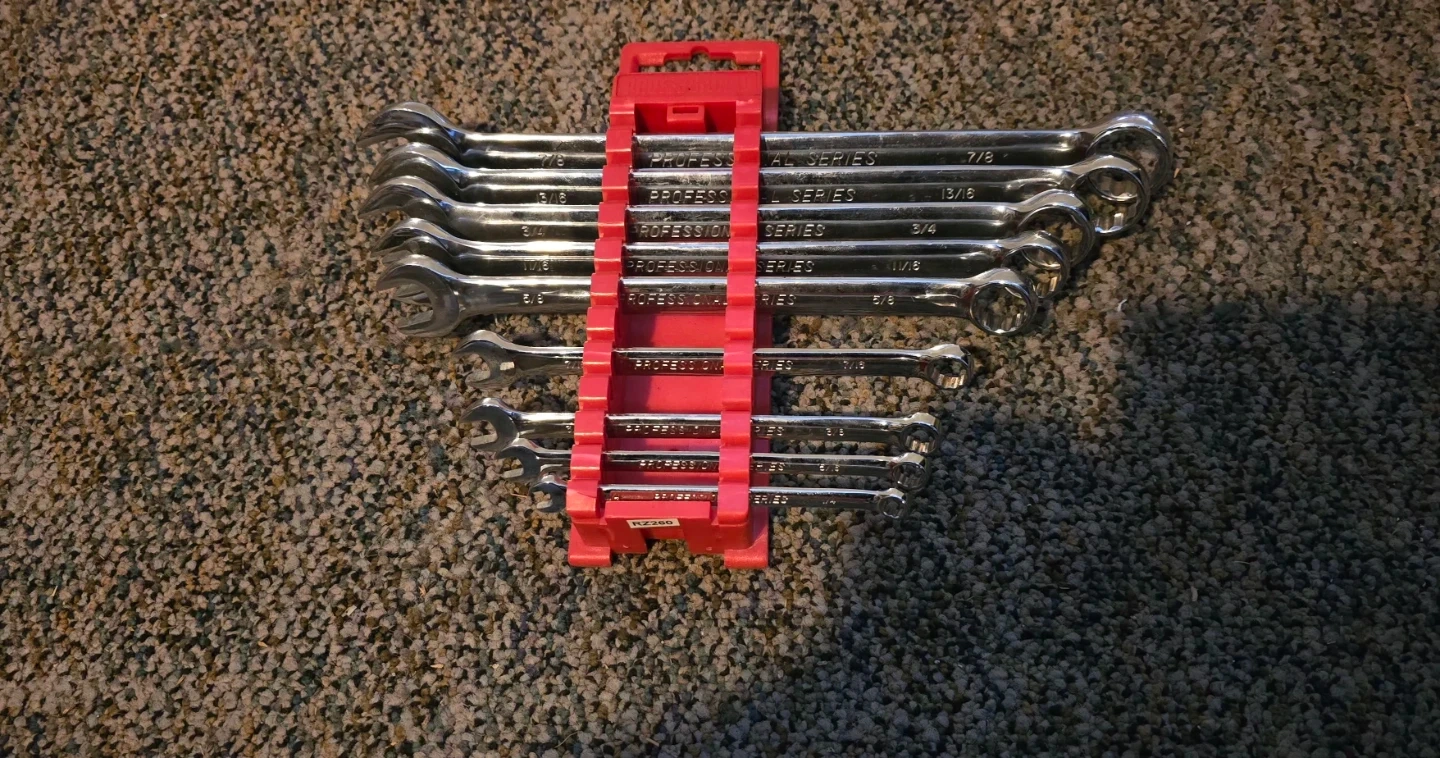 This is a set of Professional Series wrenches. Includes a red organizer rack. The set contains common SAE sizes from 1/4 to 7/8. It is missing 2 wrenches