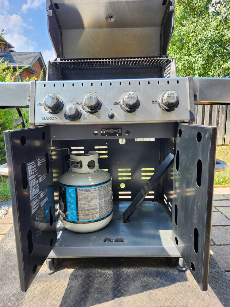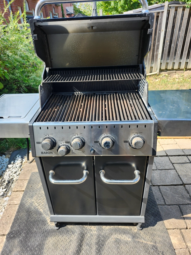 Four-burner Broil King Baron propane barbecue. Features stainless steel cookbox and side shelves. Includes propane tank. Great for backyard cooking!