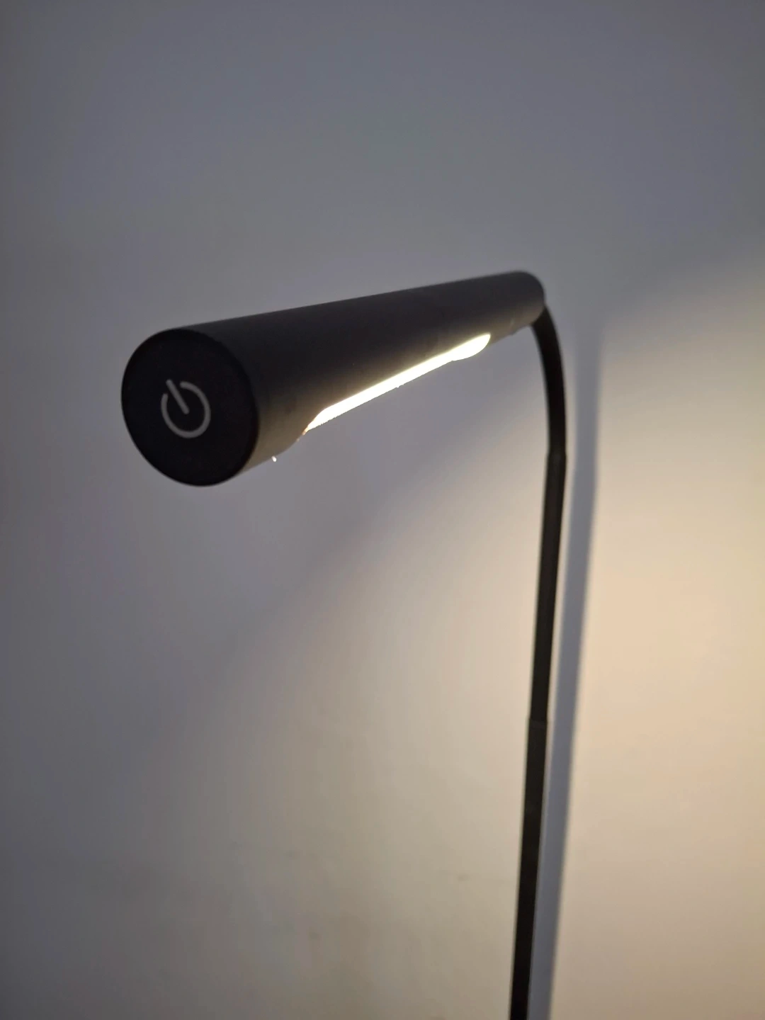 AUKEY LED floor lamp with an adjustable gooseneck. It has a simple on/off power button. The slim design fits easily into most spaces.