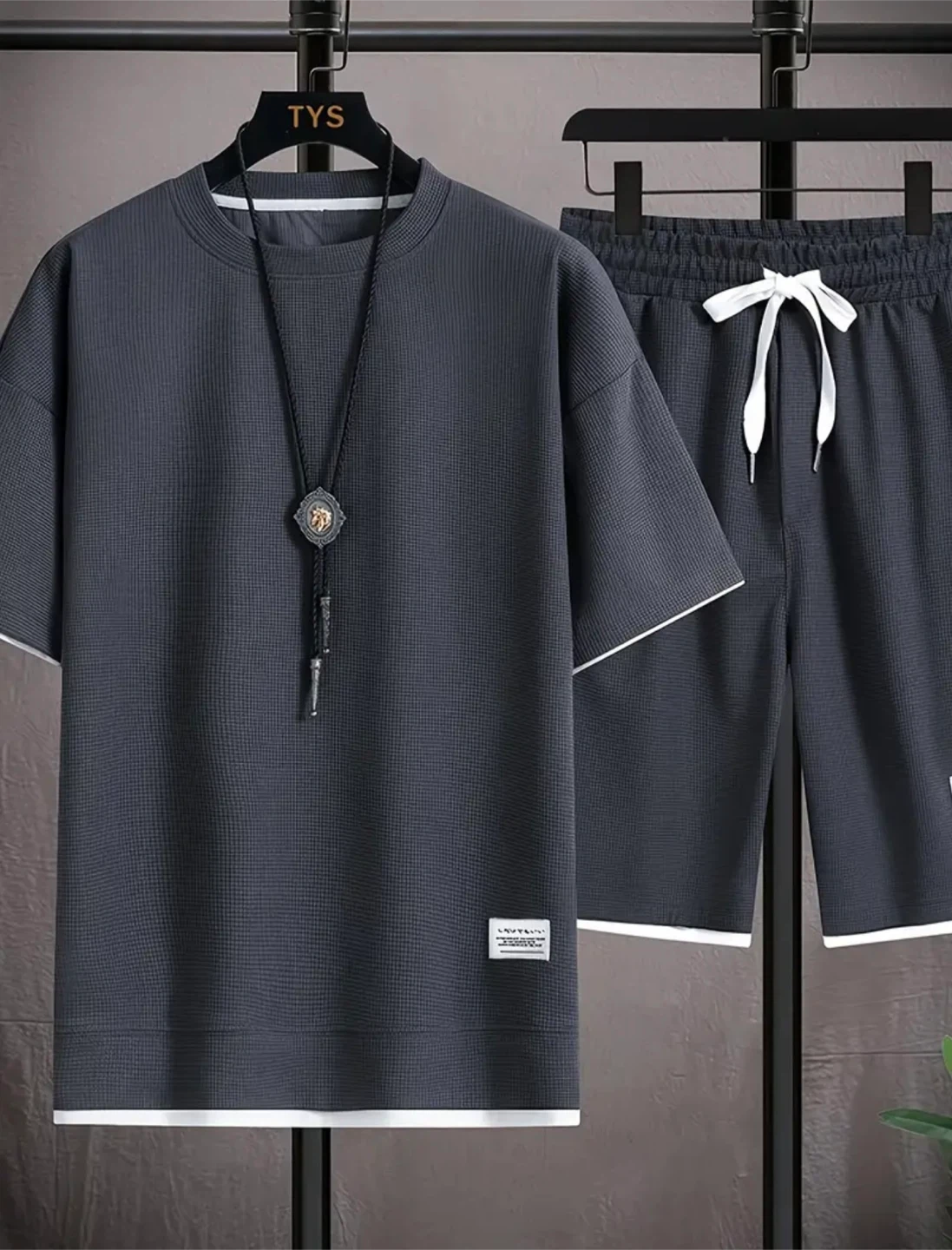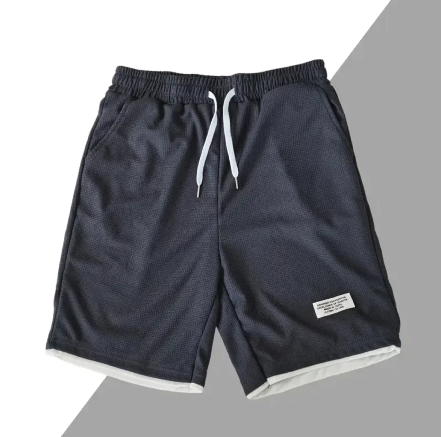 Comfy men's shorts with a waffle knit texture. Features a drawstring waist and contrast white trim. Made with excellent quality material.