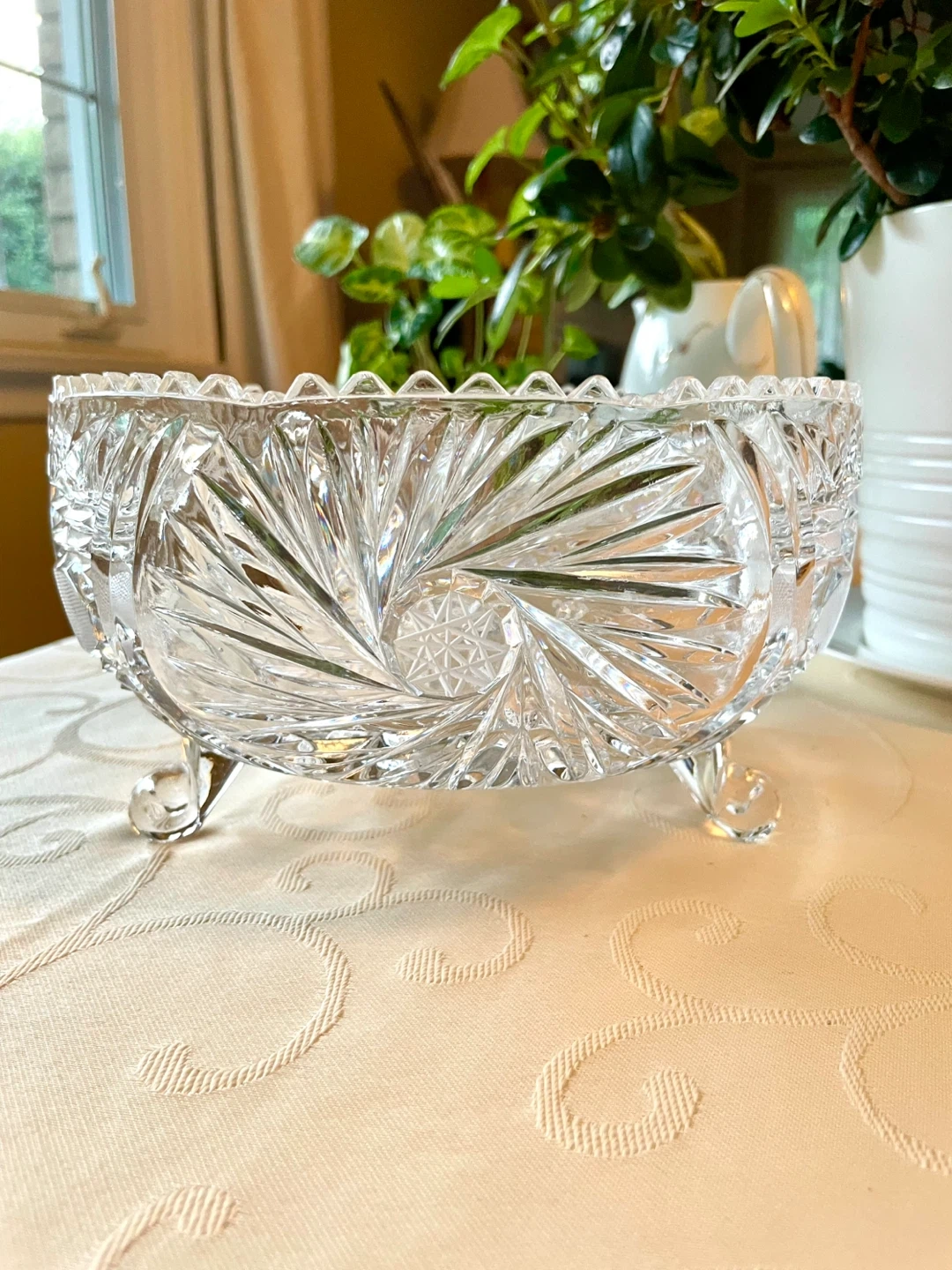 Elegant American Brilliant Cut three-footed crystal bowl with star and pinwheel design and a lovely sawtooth rim.