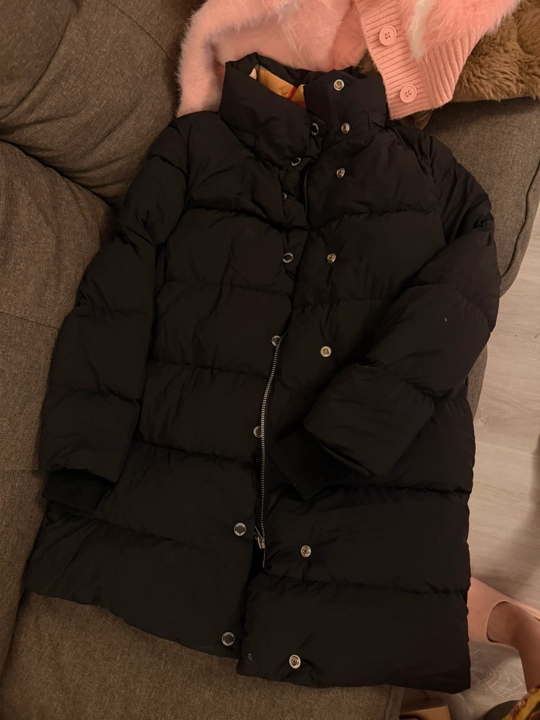 Black puffer jacket with a high collar and full zip closure. It has silver snap buttons and ribbed cuffs. Perfect for keeping warm on chilly days!