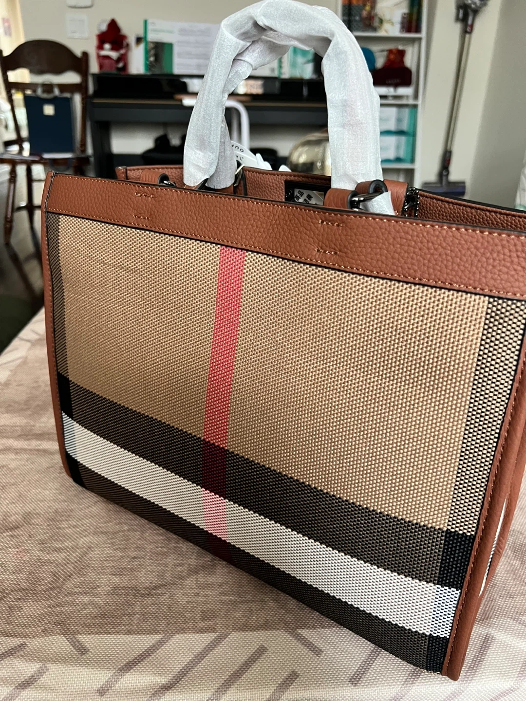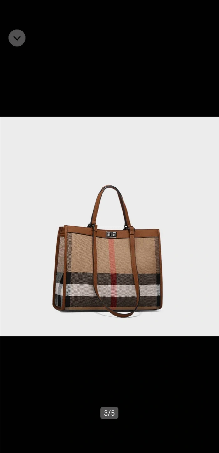 This OUFYL tote bag features the brand's signature plaid pattern with brown leather accents. It's a spacious bag, perfect for everyday use. The bag comes with protective wrapping still on the handles.