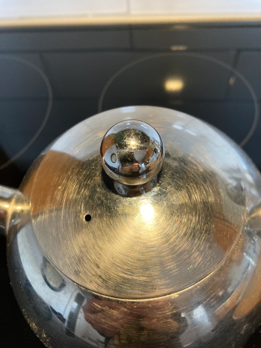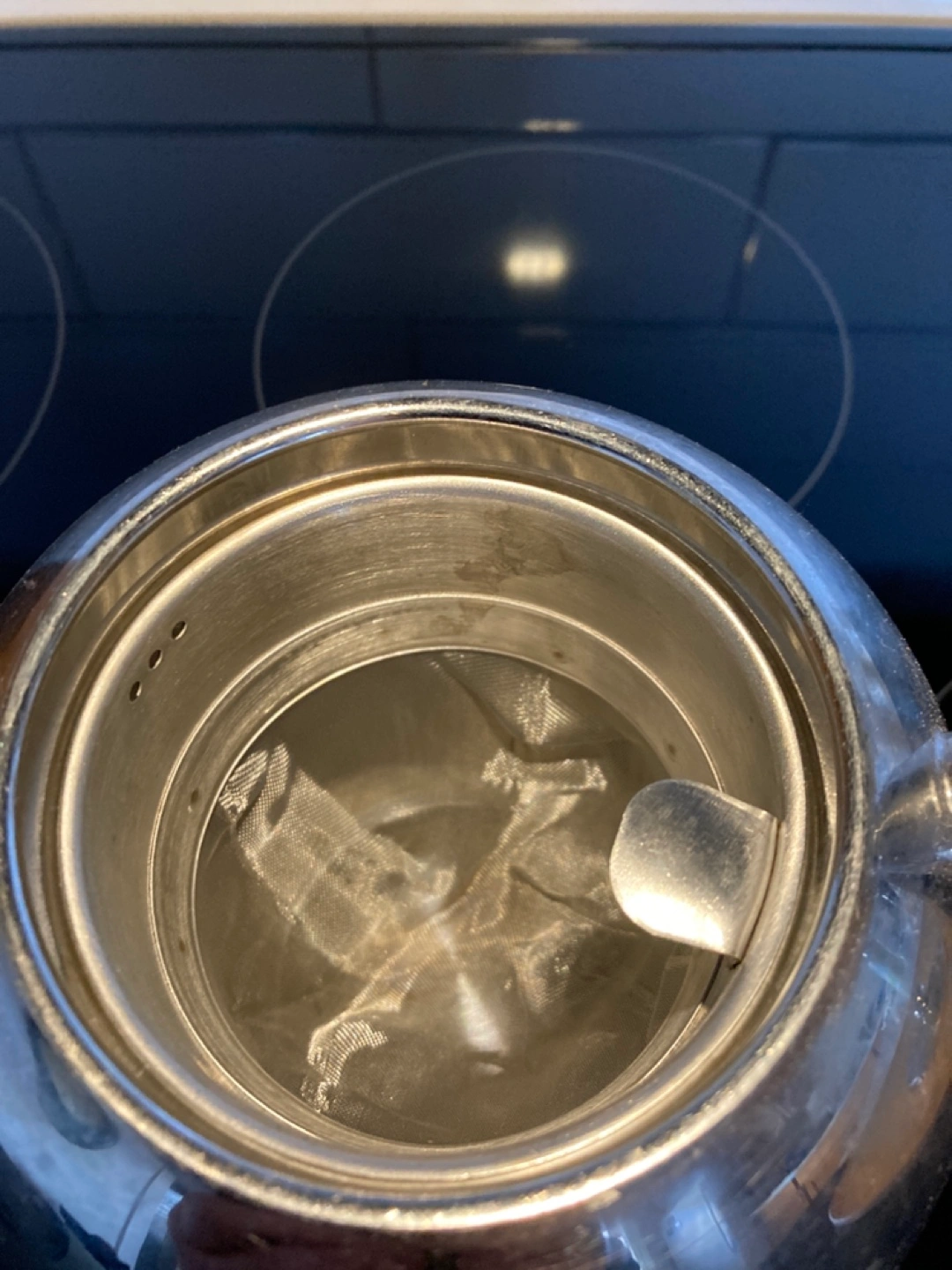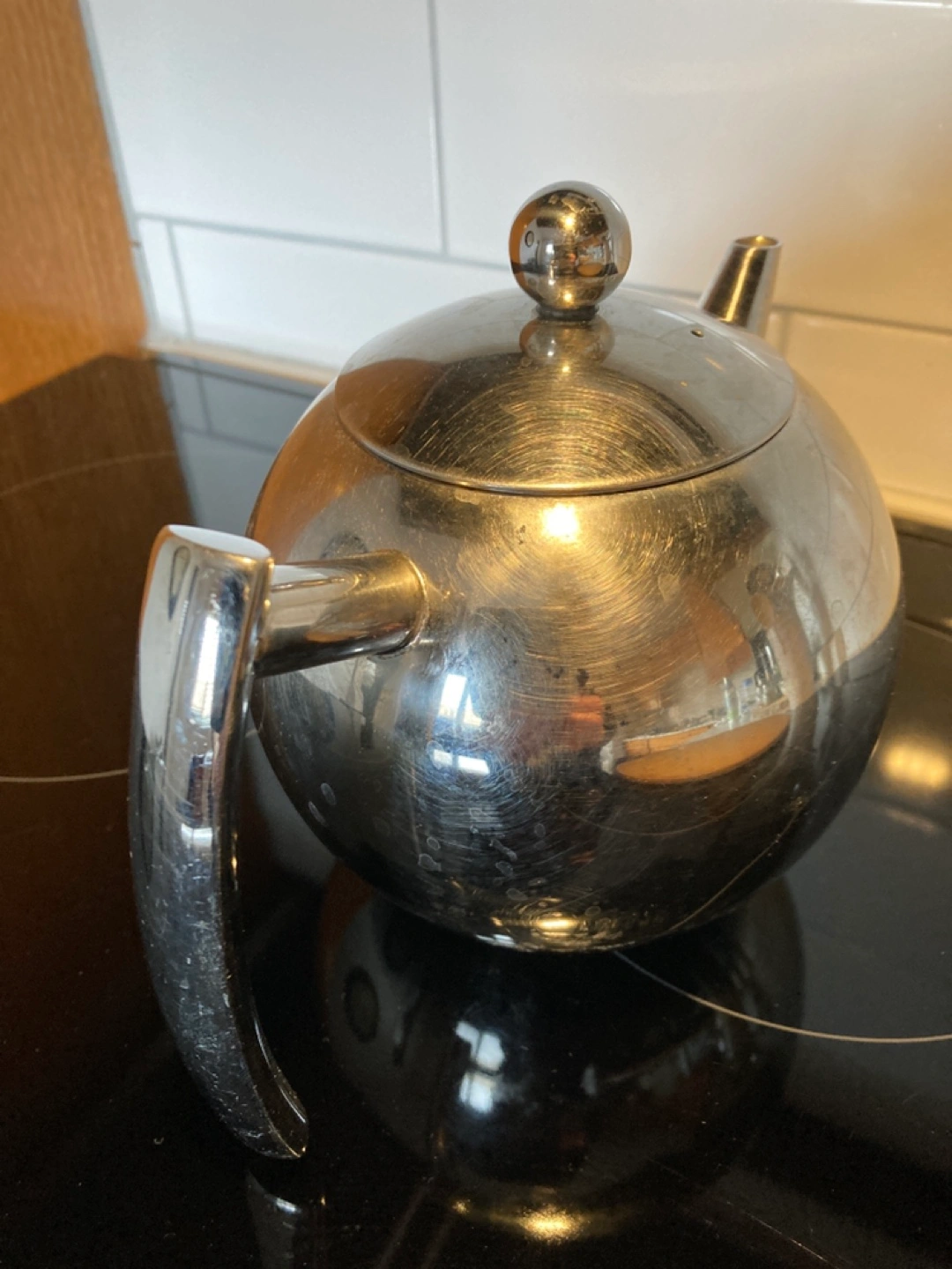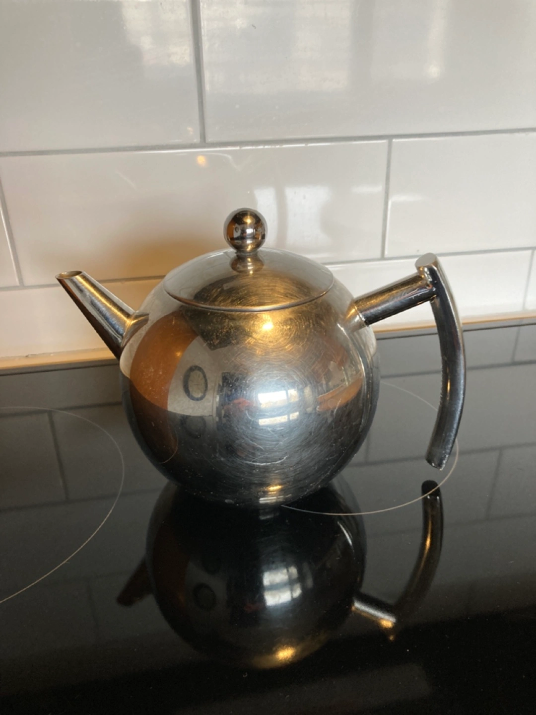 Stainless steel teapot. Built-in infuser. Round shape. Modern design.