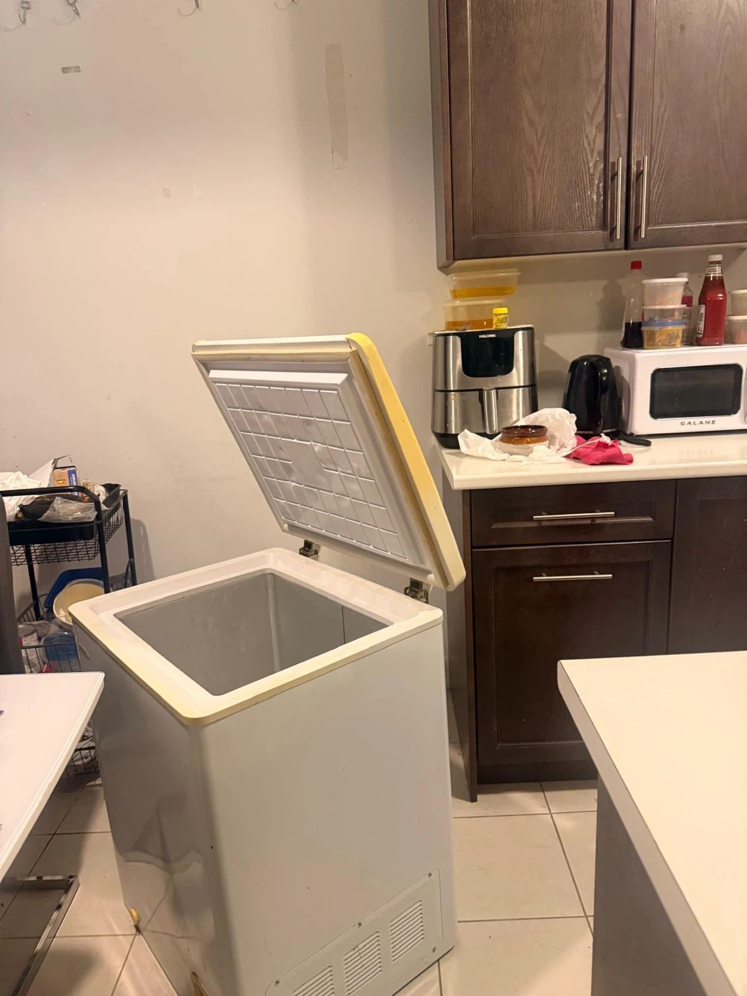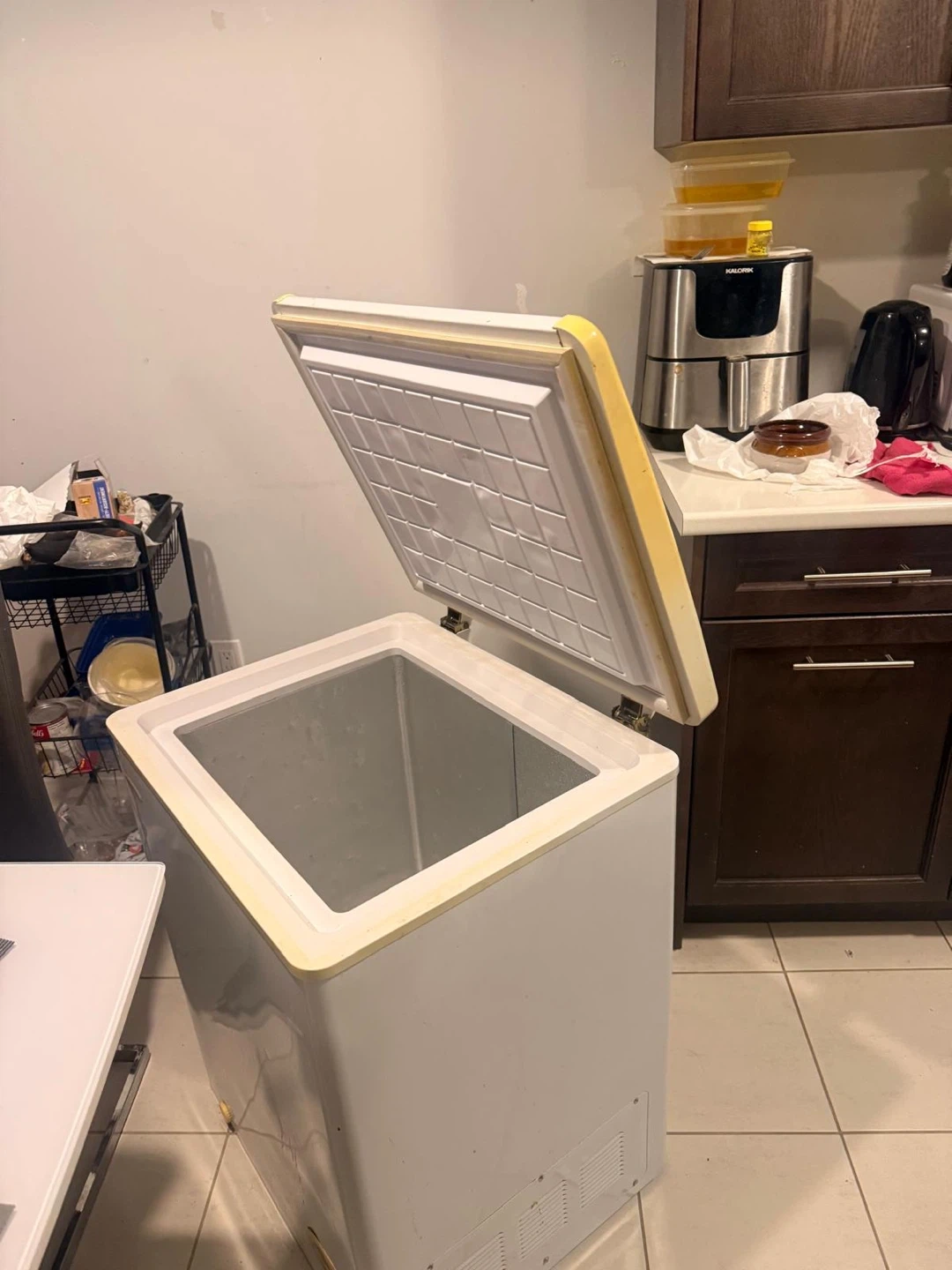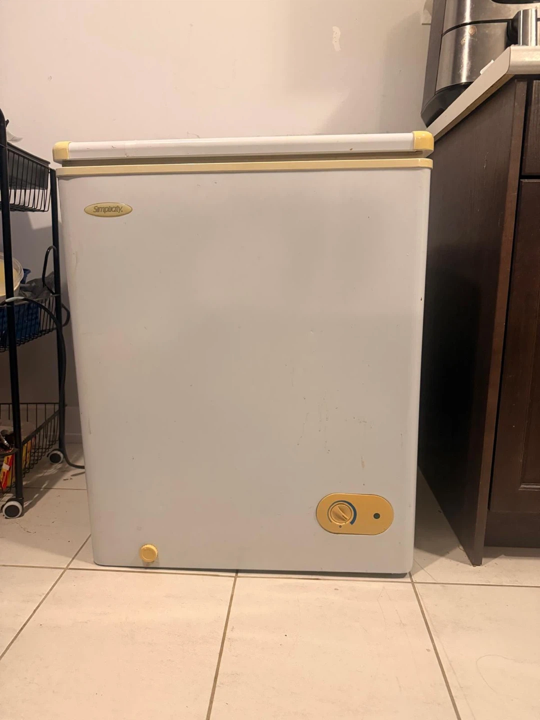 Small/medium freezer, works super excellent, 1 am buying a bigger one, no issues at all, rubber stopper to protect wall when opened. Pick up in Oshawa, I can deliver up to Whitby for $20