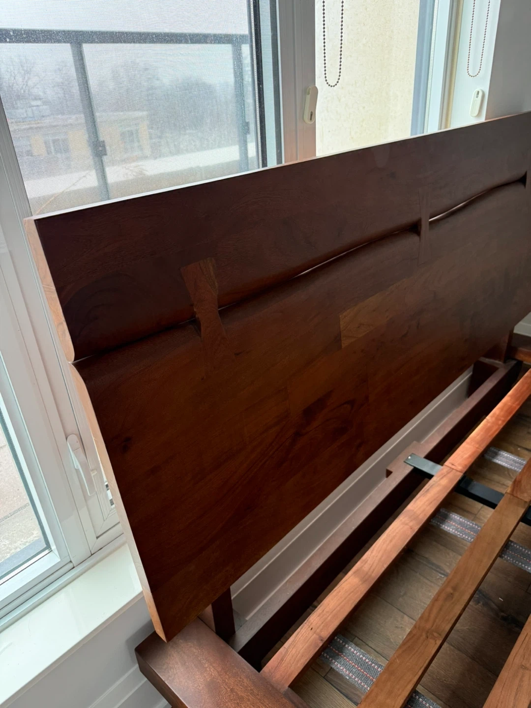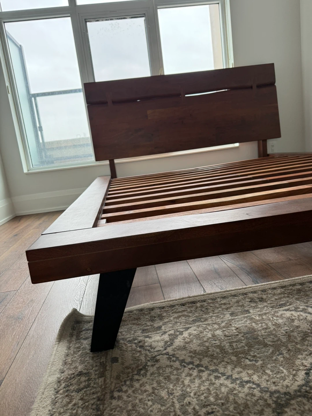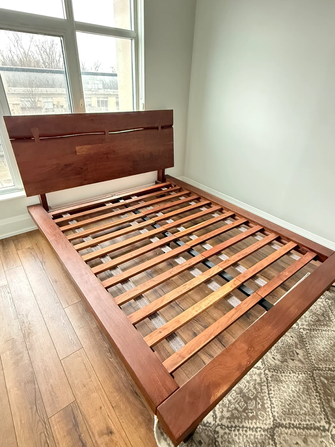 QUEEN - STRUCTUBE JAPANESE CHEERY WOOD solid wood bed frame with a modern headboard. Wooden slats provide mattress support. Dark wood finish. Purchased April 2023 for $1,100. Selling due to a move