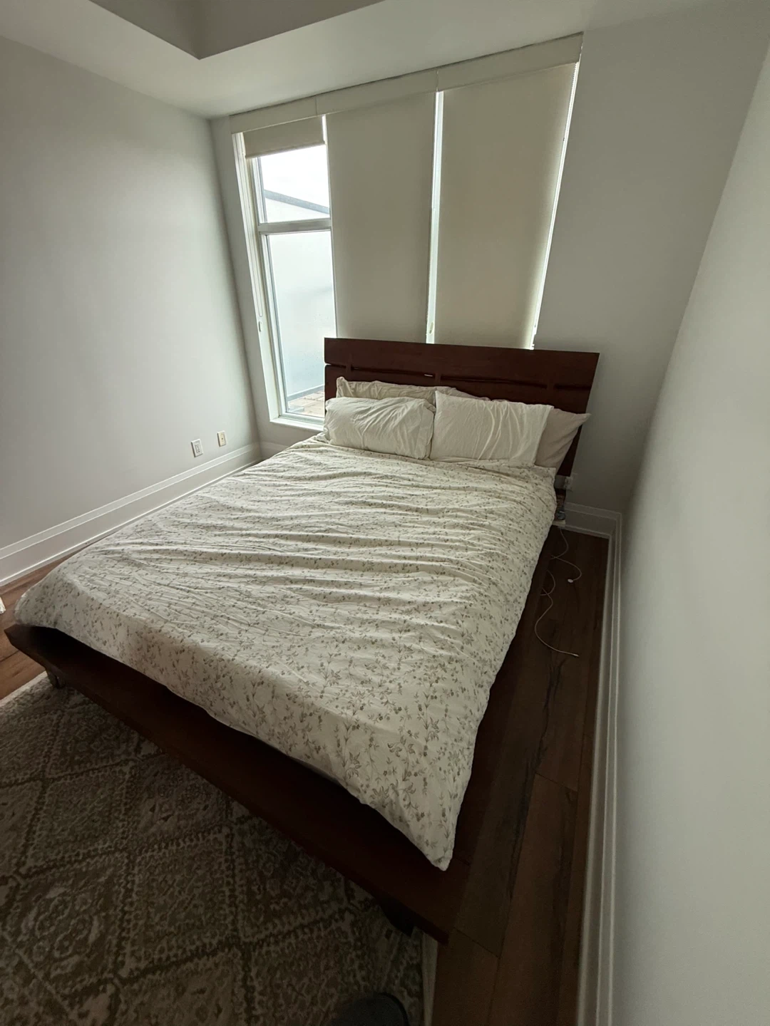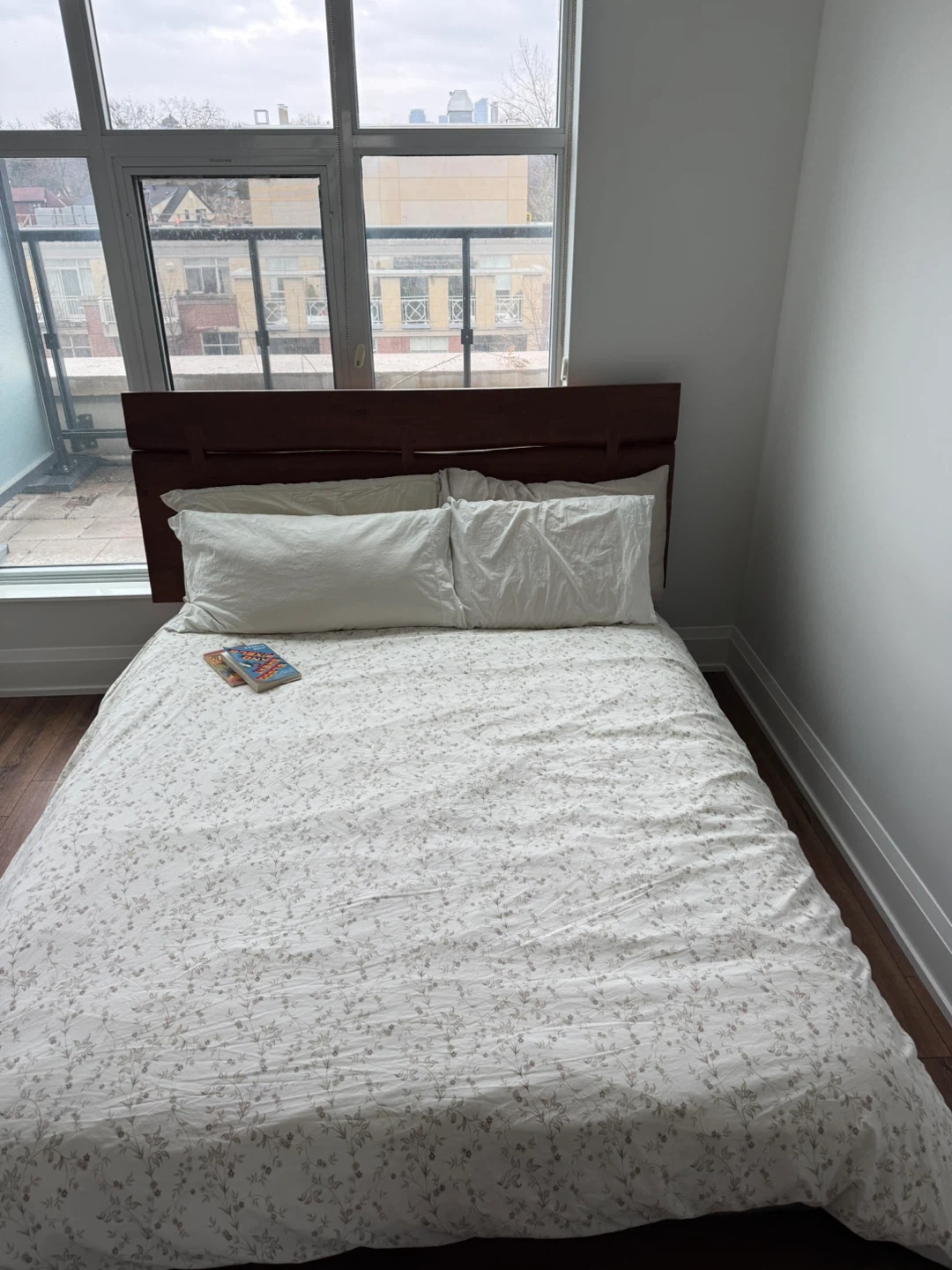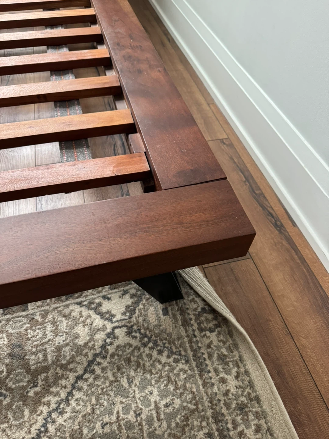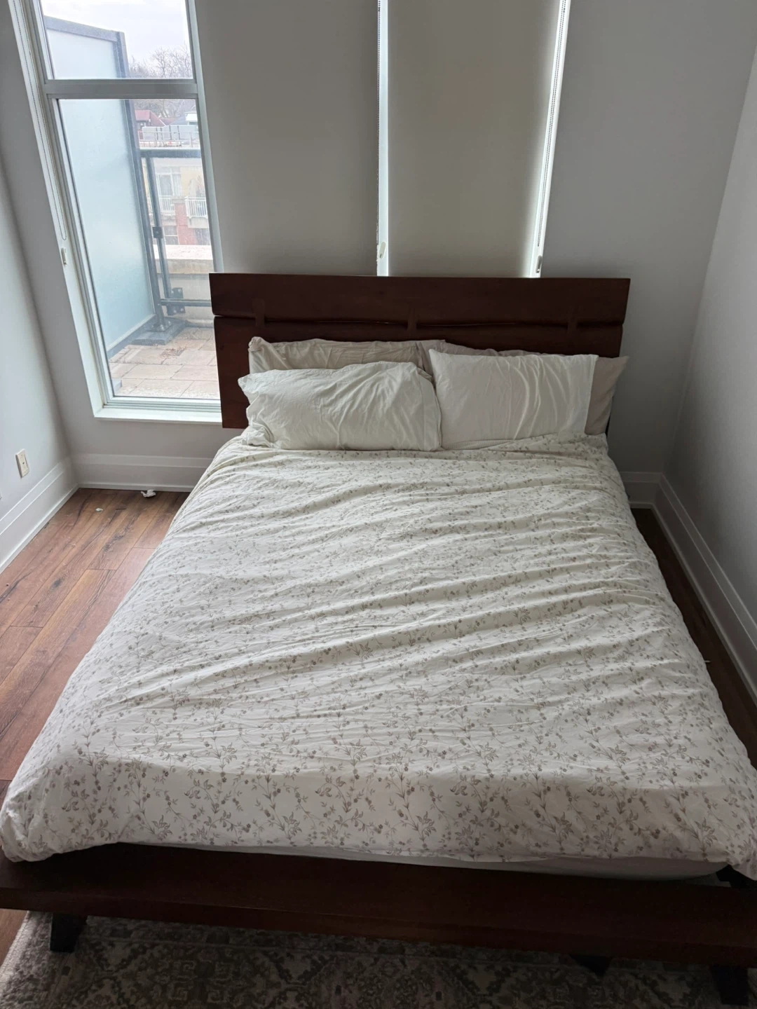 QUEEN - STRUCTUBE JAPANESE CHEERY WOOD solid wood bed frame with a modern headboard. Wooden slats provide mattress support. Dark wood finish. Purchased April 2023 for $1,100. Selling due to a move