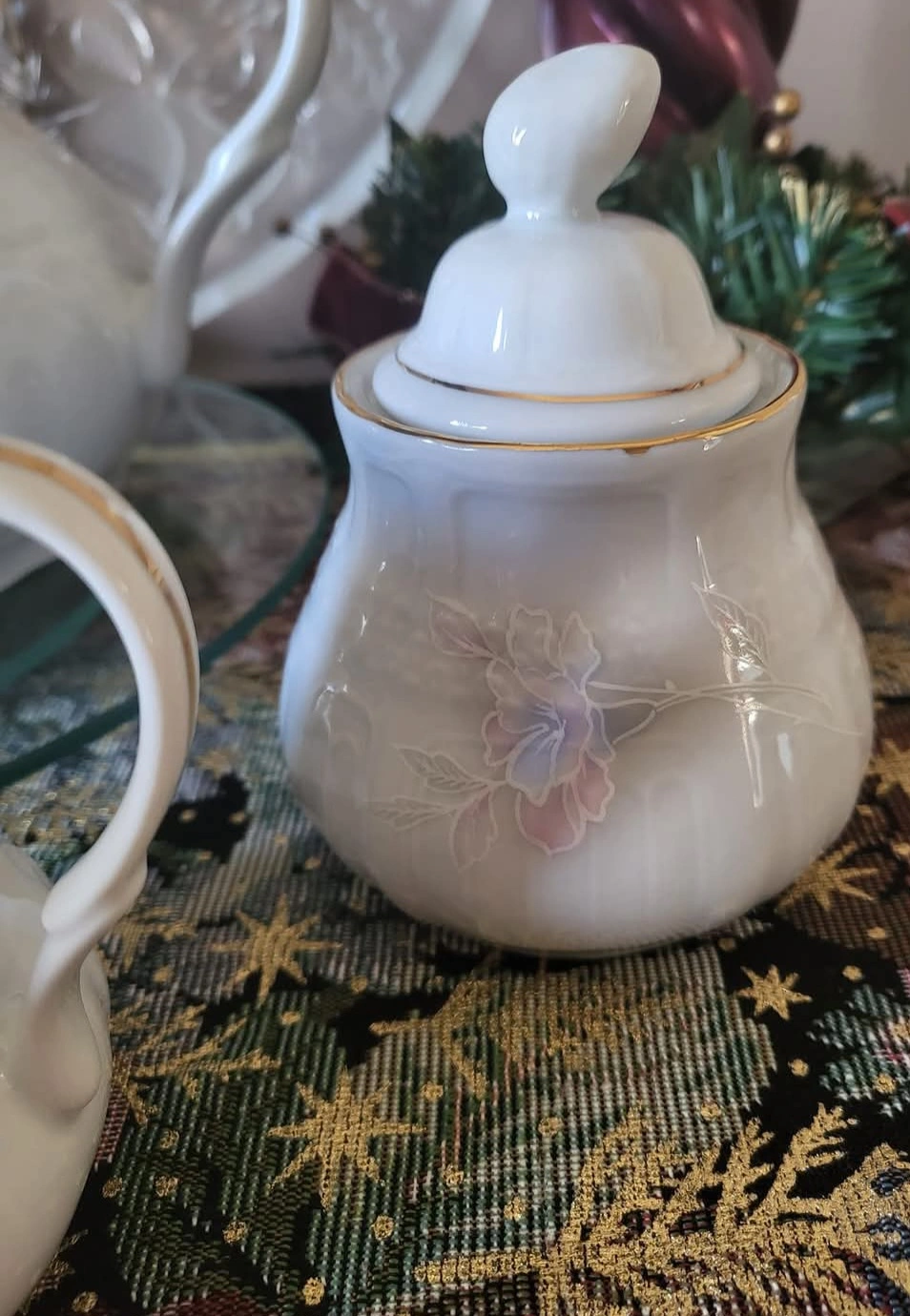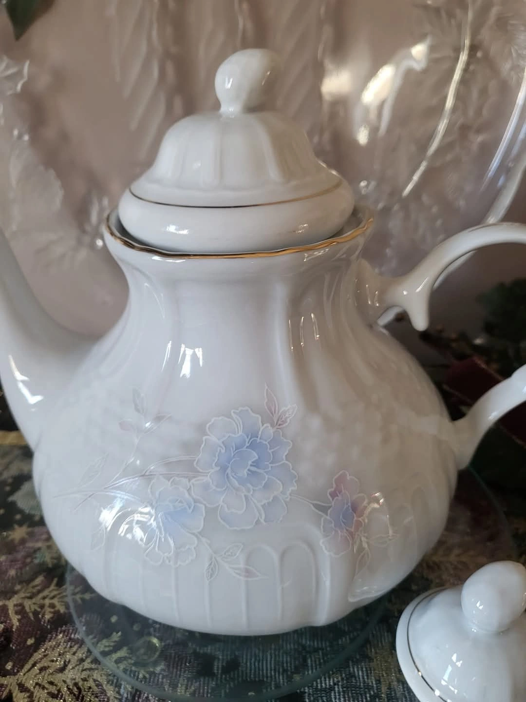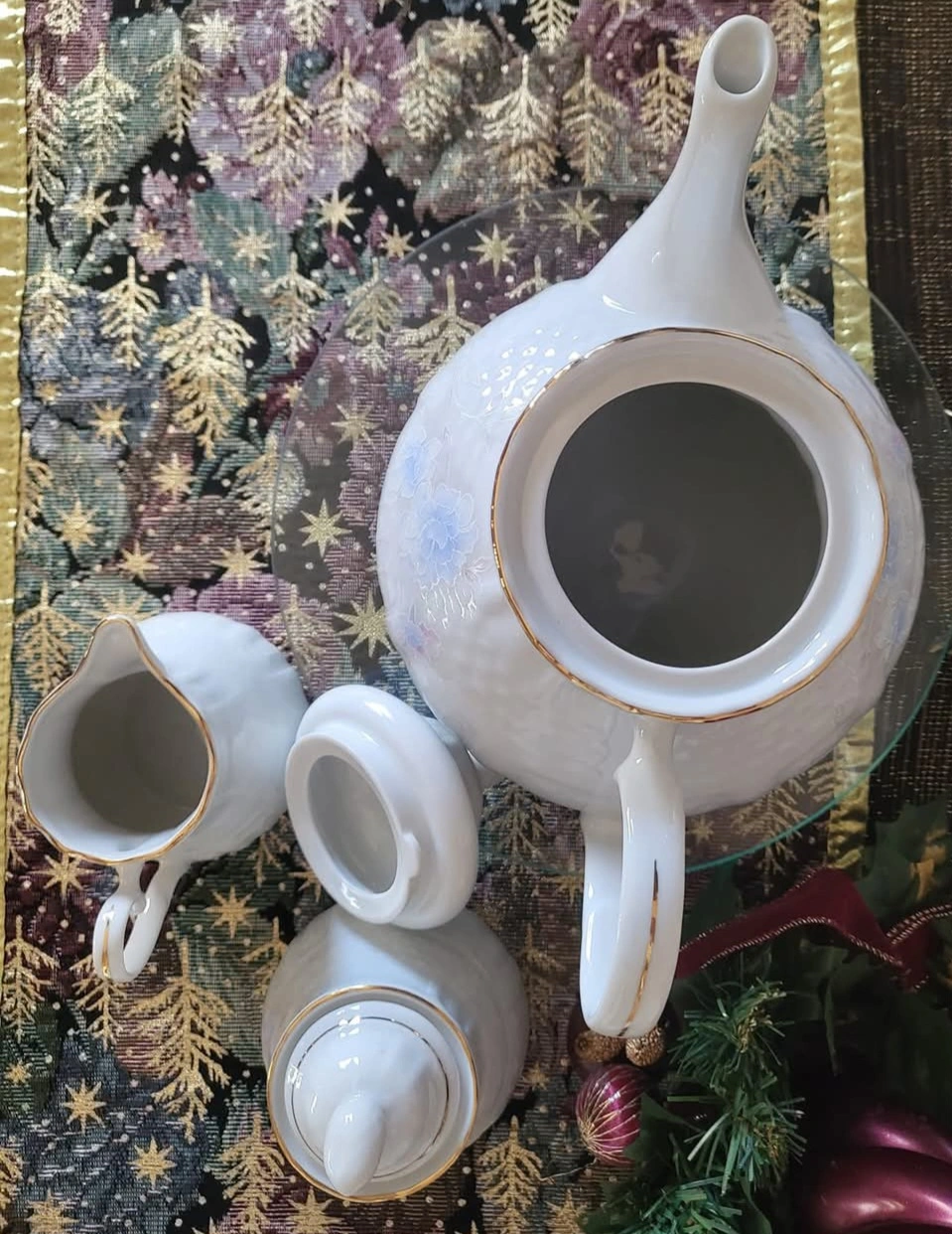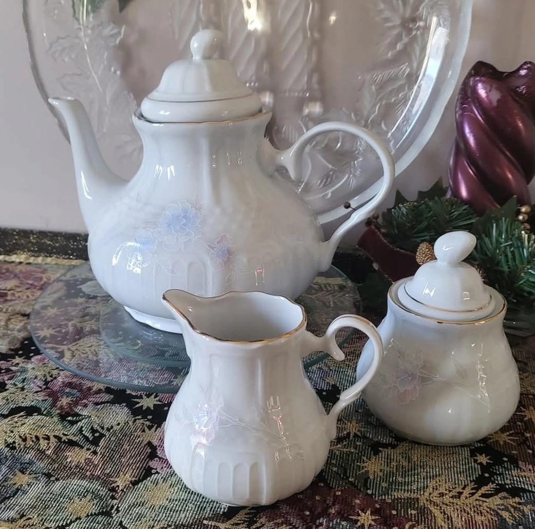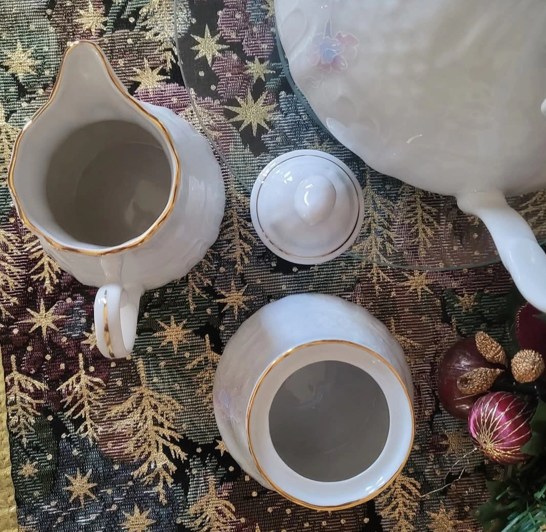 The Tea Set has Embossed Patterns All Over the Outside with Hues of Purple & Light Blue and Pretty Pink Flowers on both sides of the Tea Pot and on one side of the Creamer and the Sugar Bowl. Beautiful lines of gold accents the top on each piece as well as on the handle of the Tea Pot.