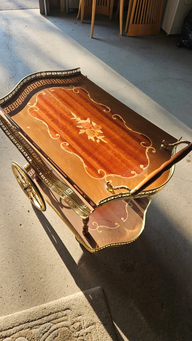 Elevate your home bar with this stunning authentic Italian Marquetry Tea/Bar Cart. Produced in the mid-20th century (c. 1960s–70s), this piece is a beautiful example of Sorrento-style craftsmanship, featuring intricate floral wood inlays (marquetry) on both the top and bottom tiers.
