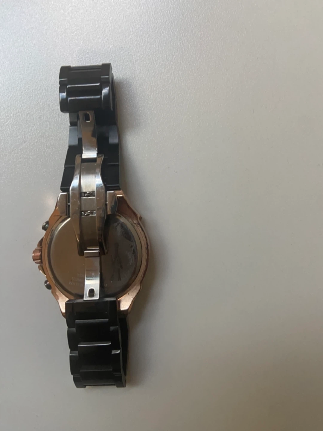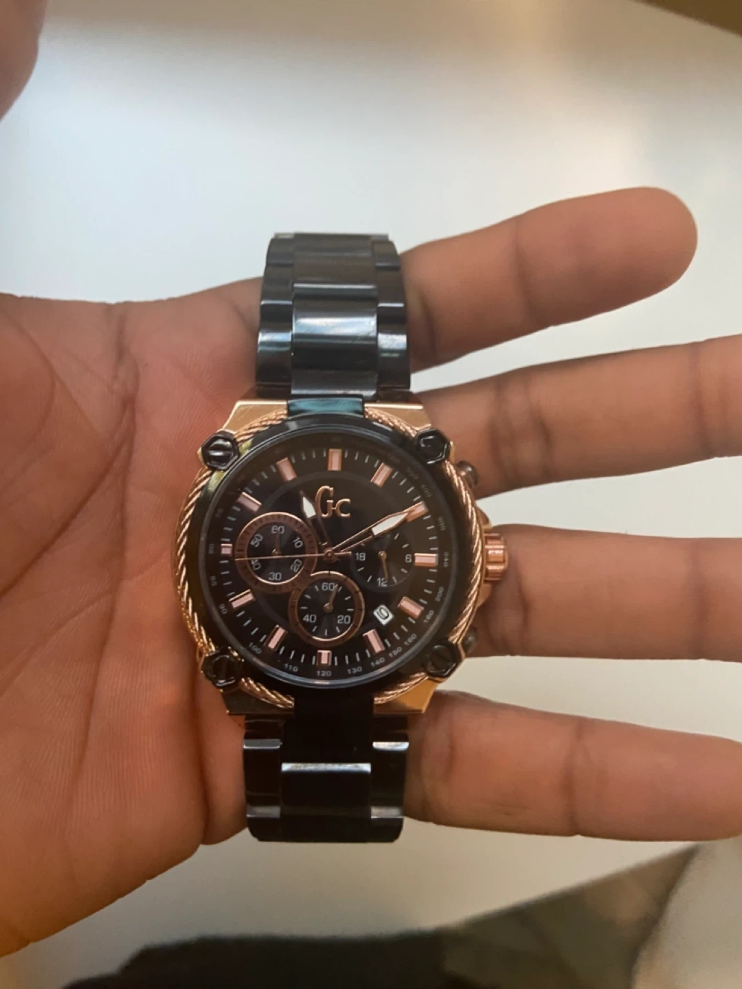 84Selling a GC watch with a black band and rose gold accents. It's in great condition and looks super stylish! I’ve had it for a short while and the only issue is the seconds hand stopped.