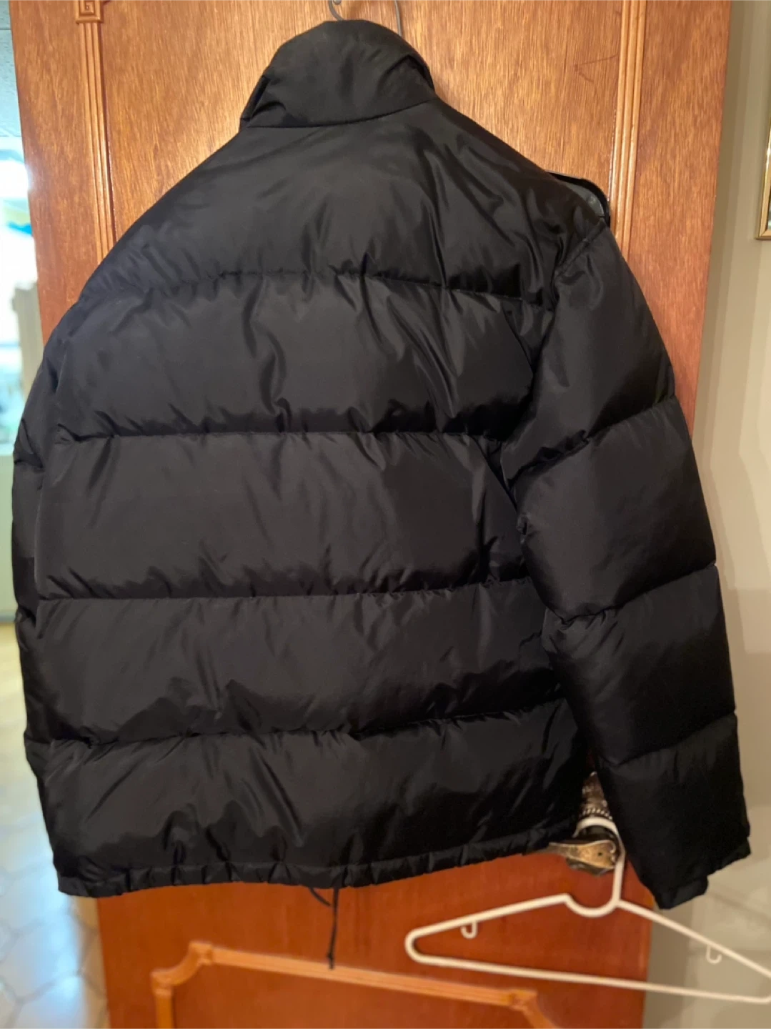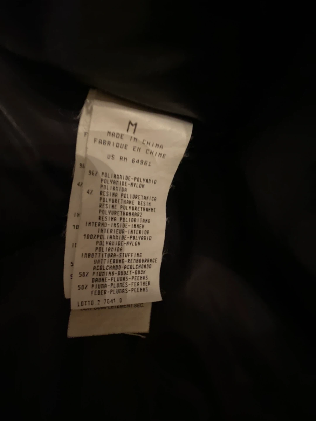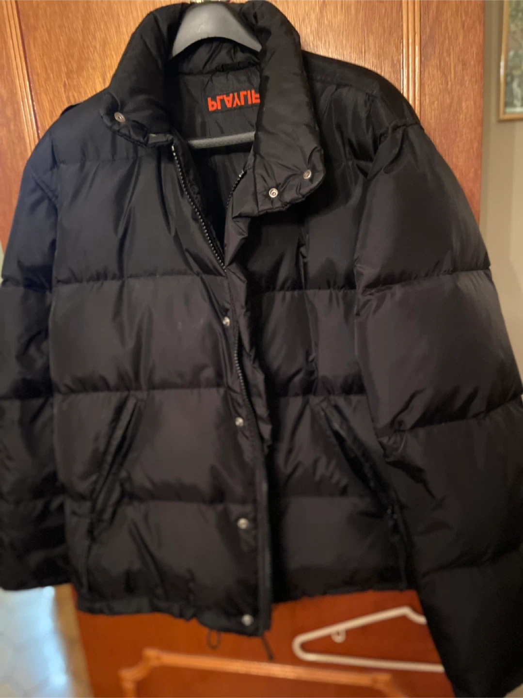 This is a gently used black puffer jacket from Brave Soul. It's a size M and made in China. The outer shell is made of polyamide/nylon, and the inner lining is 100% polyester. The stuffing is feather/down