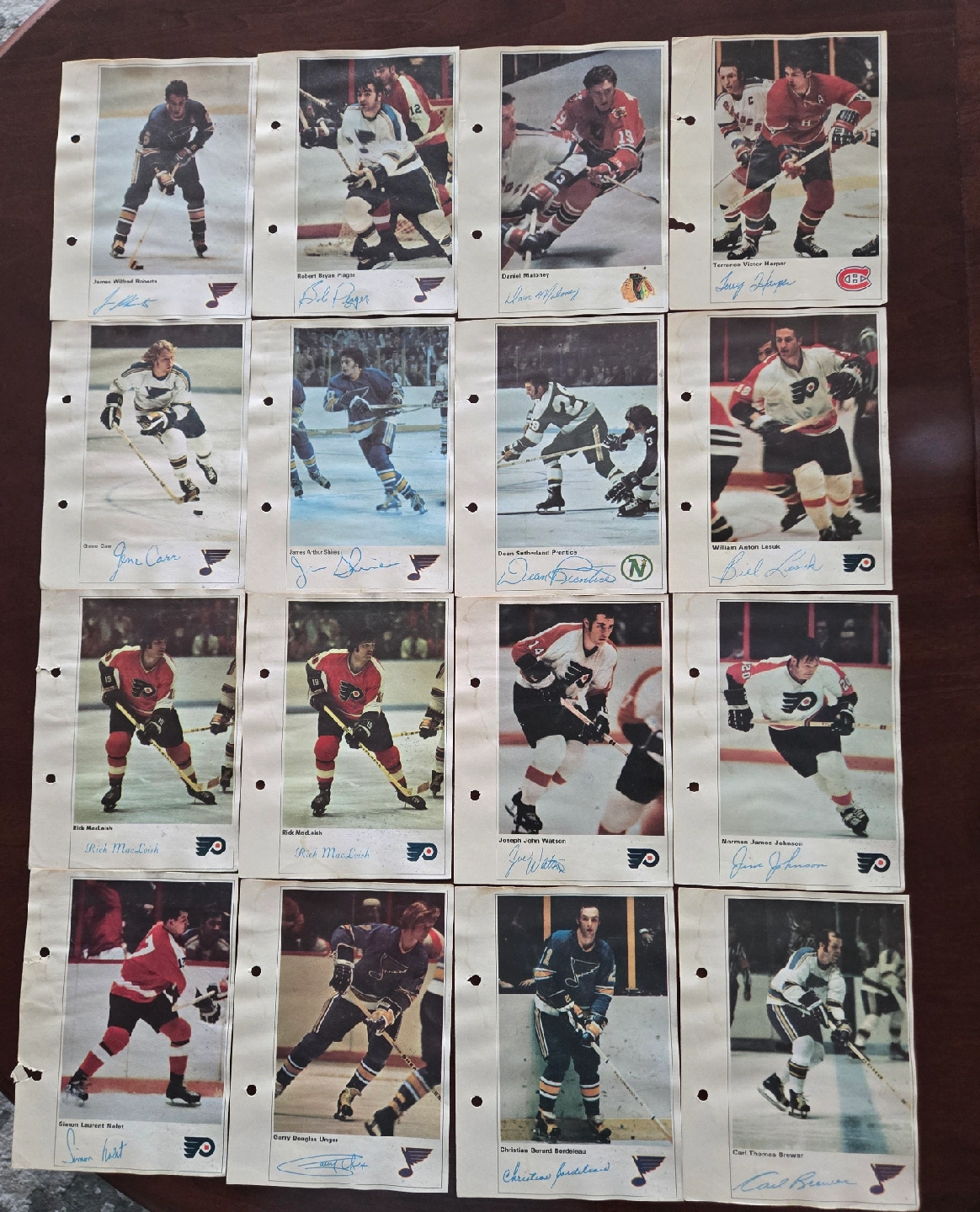 Selling a collection of 16 vintage 1971 Toronto Sun Action hockey player Photo cards! Each card features a different player in action, complete with their name and a printed signature. Great for any hockey fan or collector looking to add some classic memorabilia to their collection. Includes 2 Rick Macleish Rookies, Gene Carr Rookie, Bill Lesuk, Dan Maloney, Simon Nolet, C. Bordeleau, Gary Unger, Carl Brewer, Joe Watson, Will Lesuk, Dean Prentice, James Shires, Terrence Harper, Bob Plager, James Roberts. They have some wear and tear, but there all intact, considering there age. ASKING ONLY $25 FIRM.