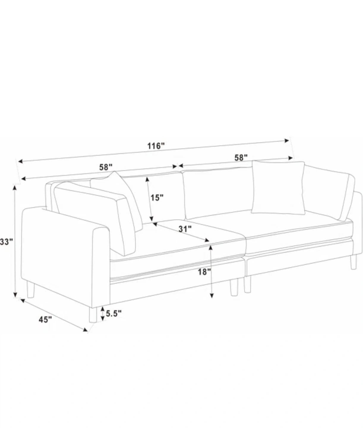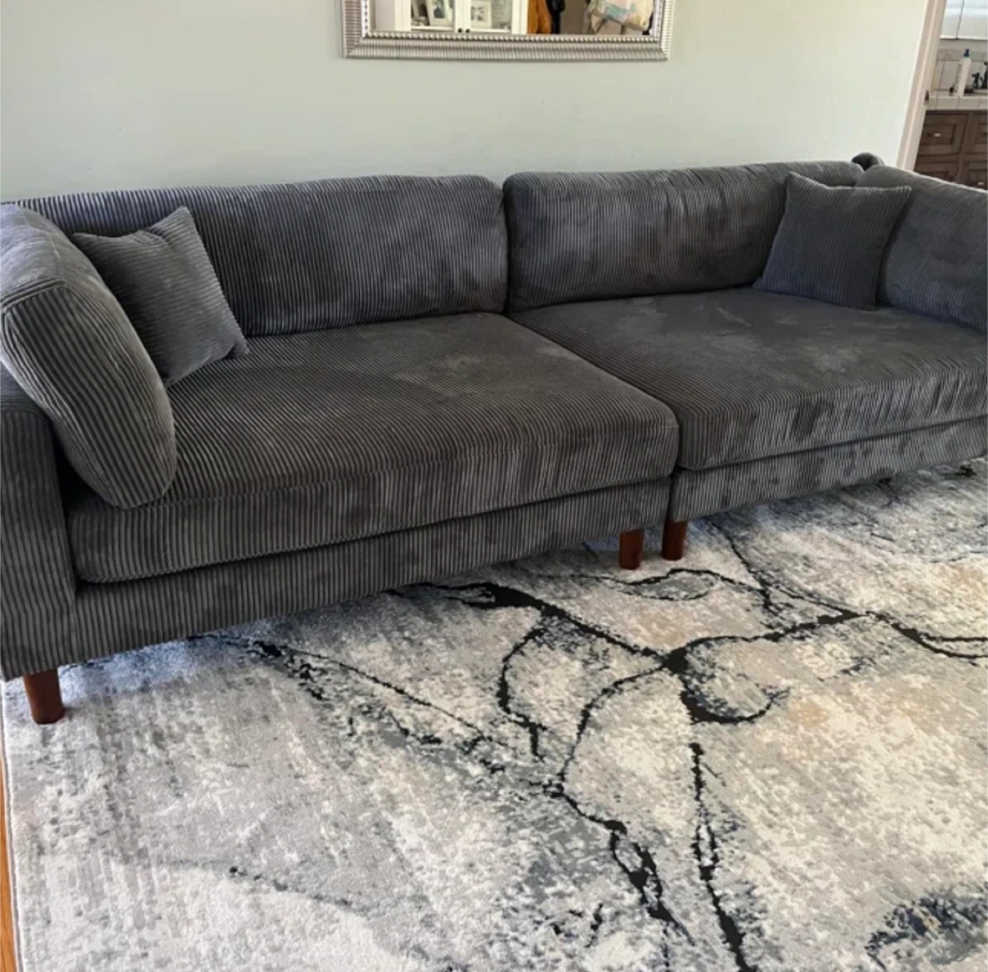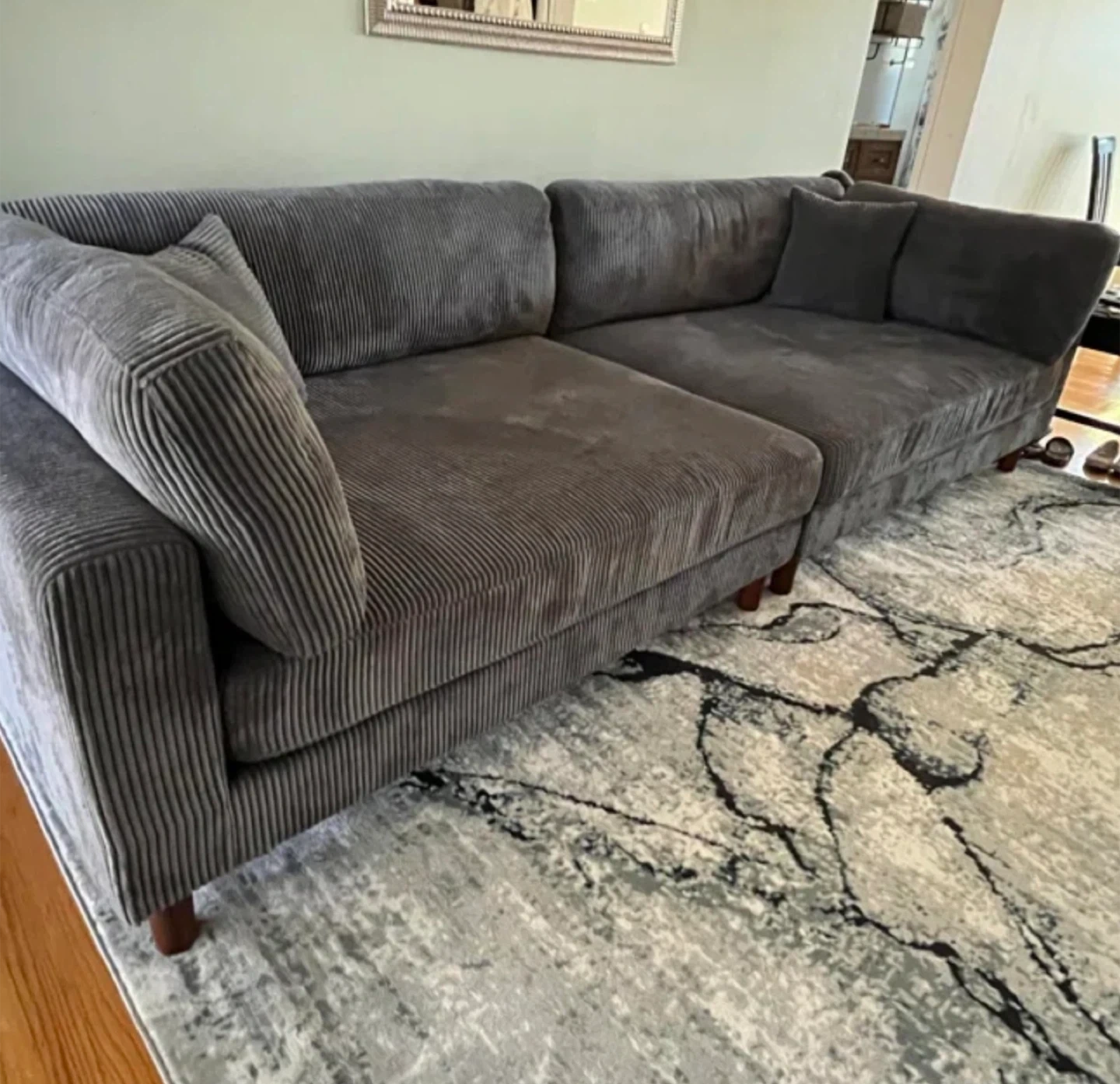 Selling a comfy grey corduroy sectional sofa. It's in good condition and perfect for a living room. The sofa is 116 inches long, 33 inches high, and 45 inches deep. It features a modular design. It’s in great condition—no rips or stains. Comes from a smoke free home. Pickup only.