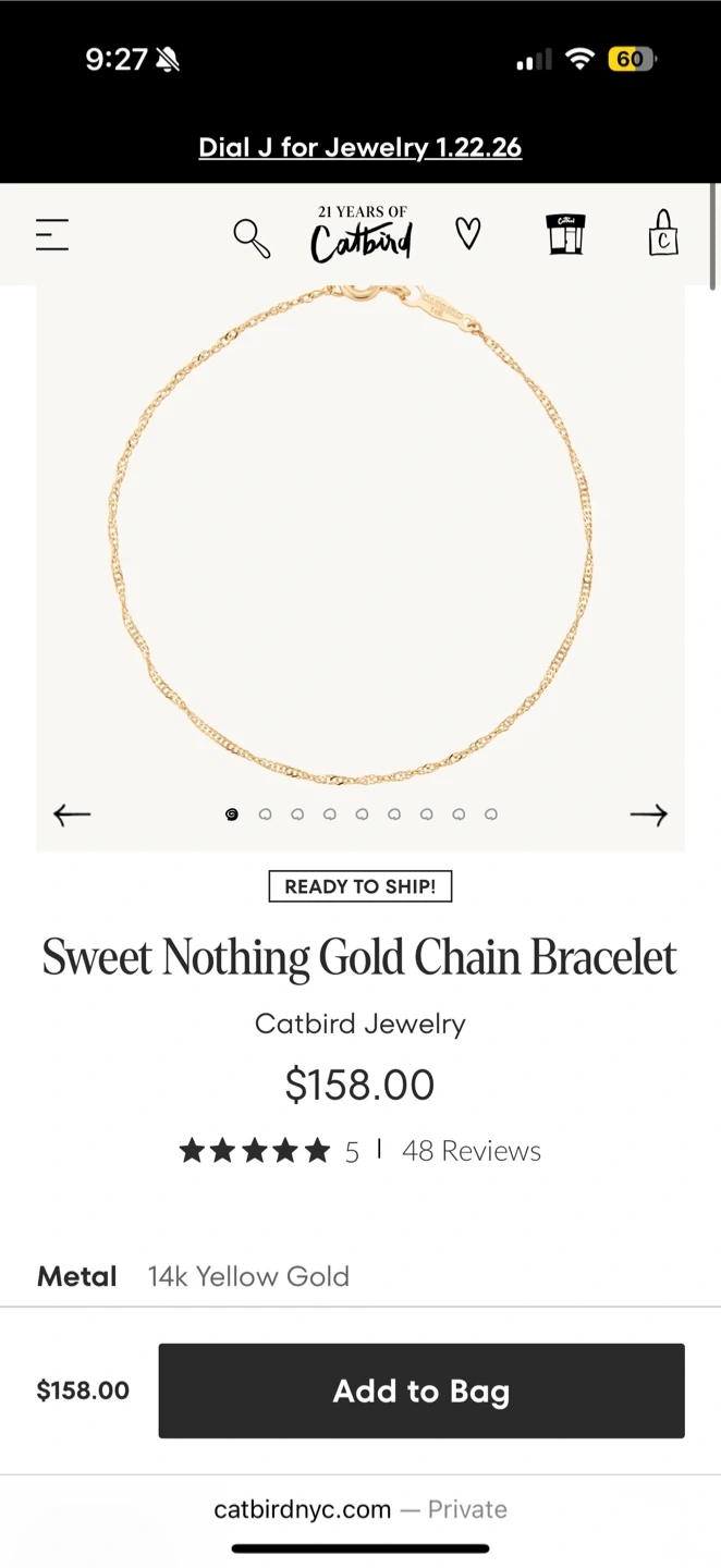 Selling a Catbird Sweet Nothing bracelet in 14k yellow gold! It's a delicate and beautiful piece. Originally bought for $158, it's in great condition and comes with the box and packaging. Perfect for adding a touch of elegance to any outfit!
