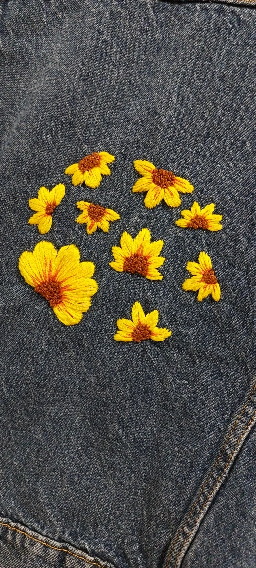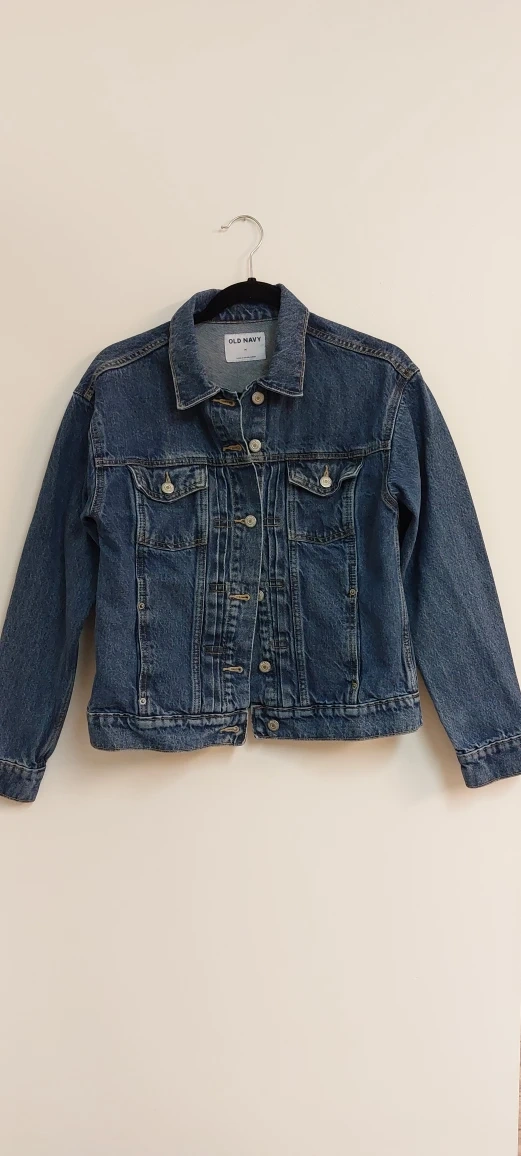 Here's a cute Old Navy denim jacket in a size medium! It has a fun sunflower design on the back (handmade embroidered), adding a touch of whimsy to a classic style in winter!