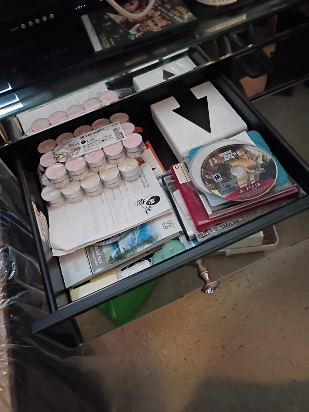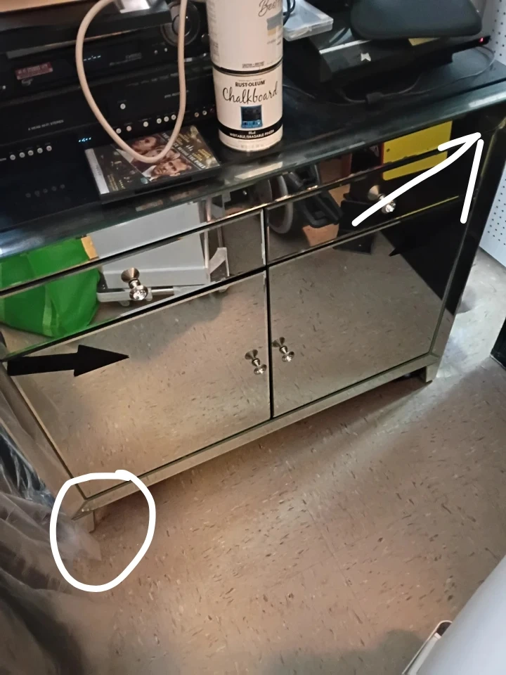 You see on the mirrored doors I put there yes it has cracks but the arrows cover it very well and it's a trend these arrows. Again it's fine I'm selling it because need the space. I just bought these tall cabinet wall units that took up a lot of space and need to send this here mirrored cabinet to a good home. The drawers are fine they roll really nice the are in tact and the doors also they have ample space and you can put a TV on it. Or just use it as a cabinet. The parts that I could not hide I highlited it with a white circle and a white arrow. I was going to add shiny black contact paper but I could not bend due to my accident a long time ago. But yes great idea.