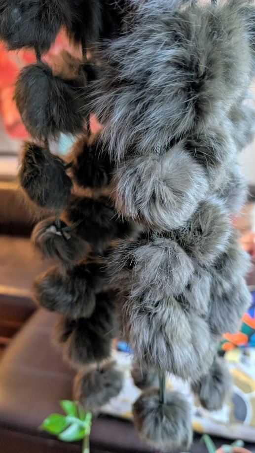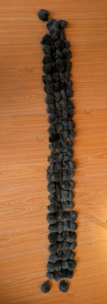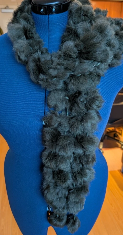 Selling a fur scarf with pom poms. It's a unique and stylish accessory to keep you warm and add a touch of fun to your outfit!