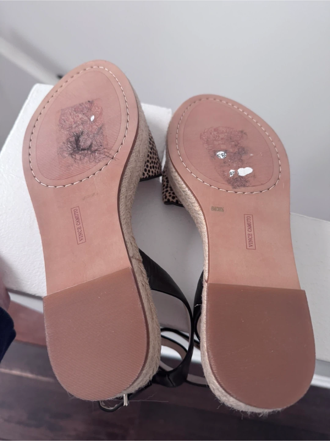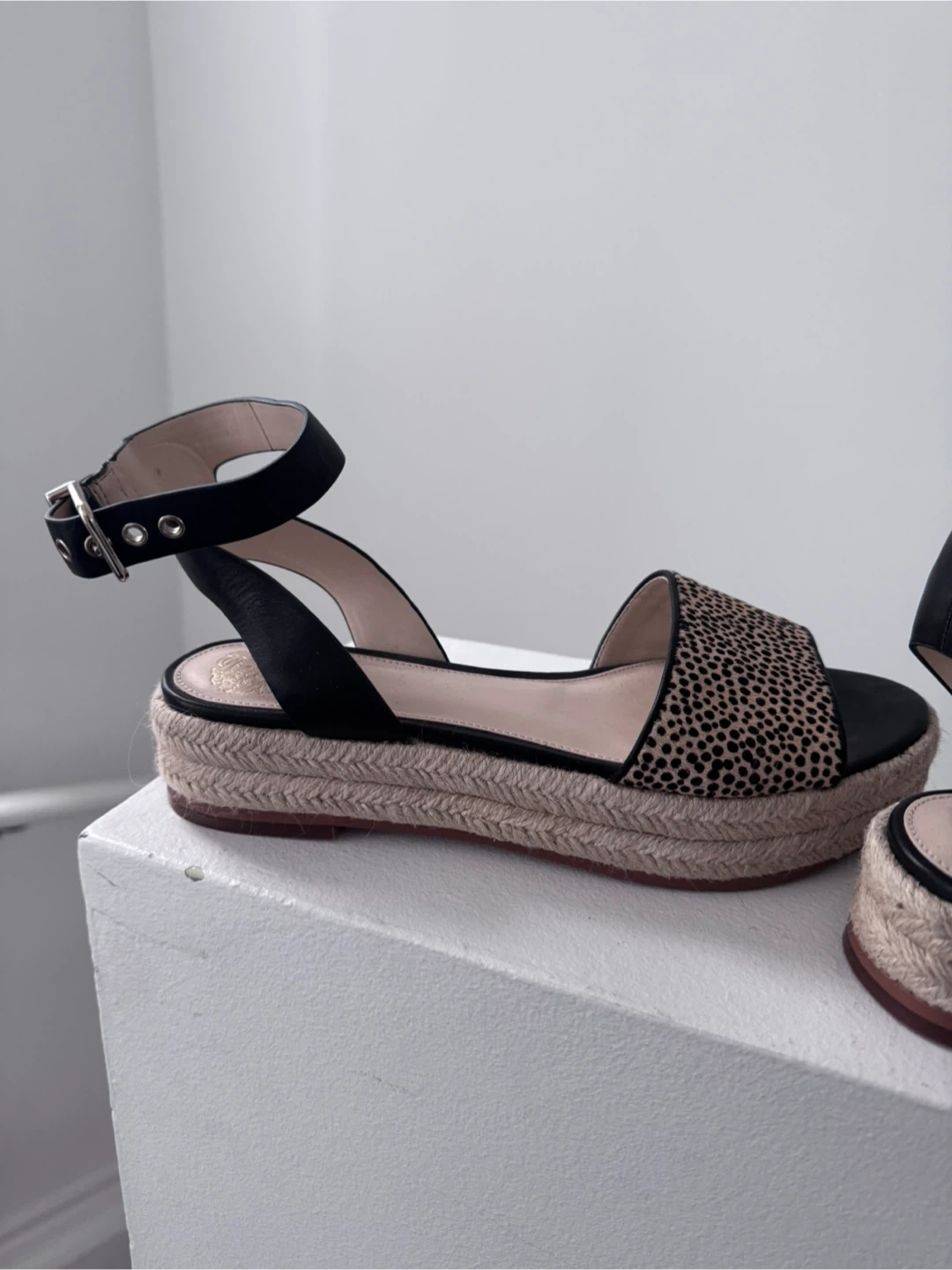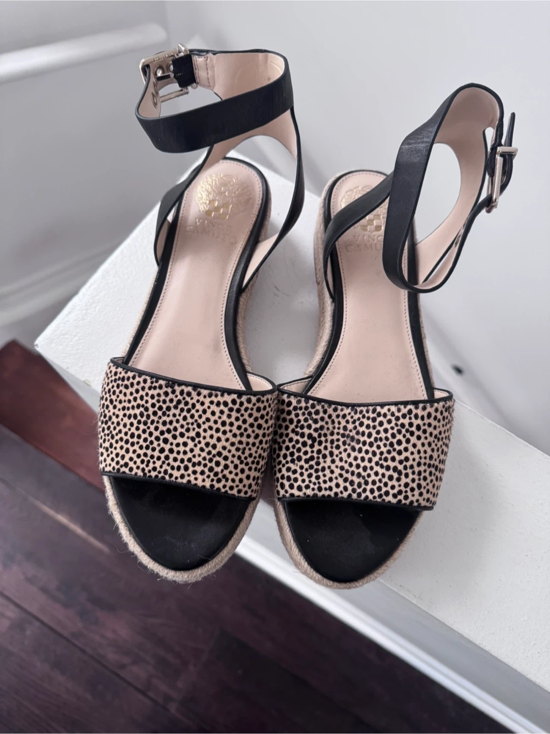 Vince Camuto espadrille wedge sandals with a trendy leopard print, pony hair strap. Features a comfortable ankle strap with buckle closure. Platform sole with braided jute detail. Never worn