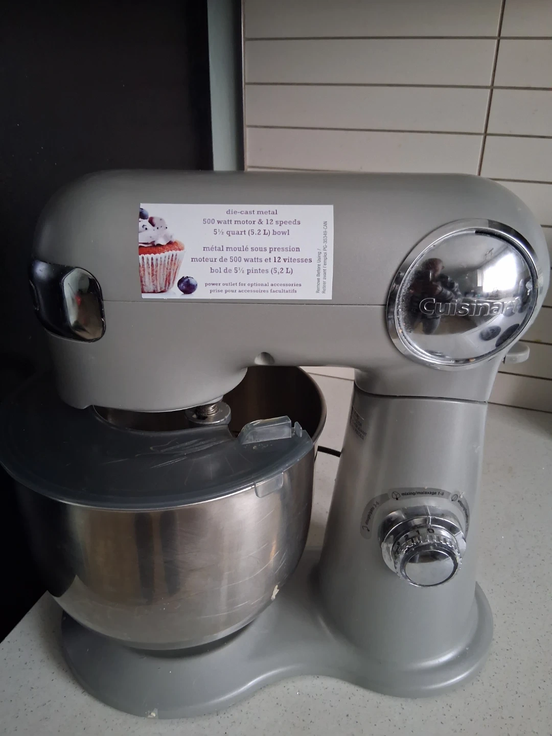 This is a die-cast metal Cuisinart stand mixer. It has a 500 watt motor with 12 speeds and a 5.5 quart (5.2 L) bowl. It also features a power outlet for optional accessories.