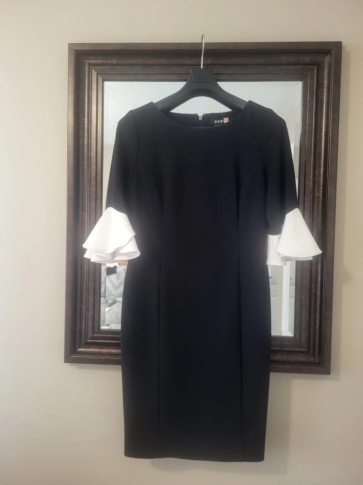 DKNY black sheath dress. It's got eye-catching white ruffle flare sleeves. A classic style for any occasion!