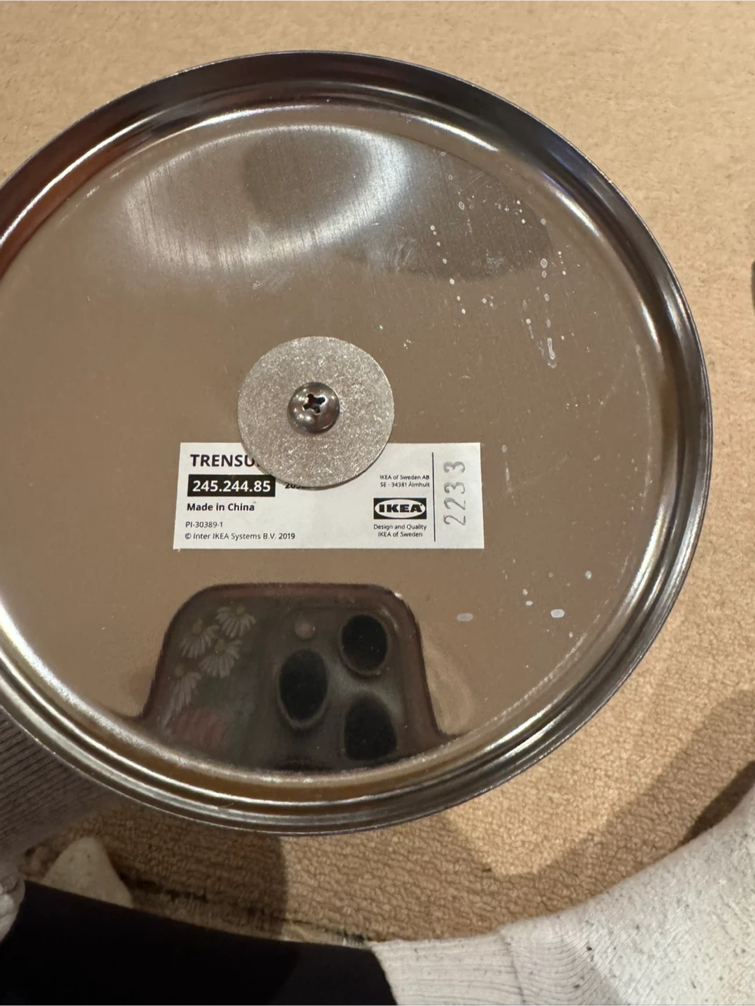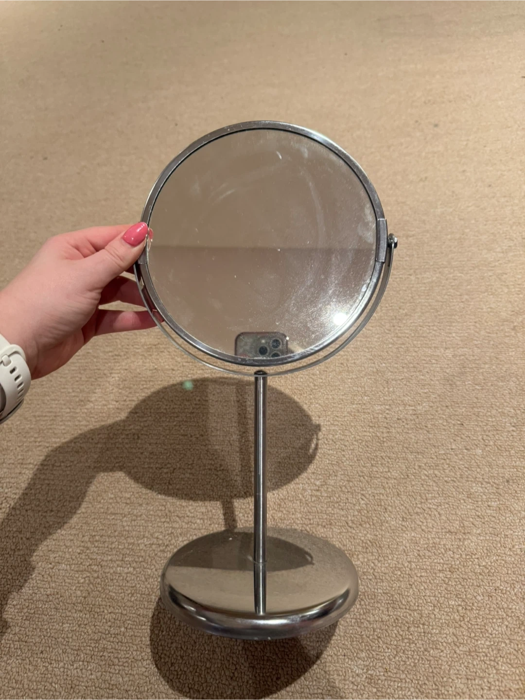 This IKEA TRENSTAD vanity mirror has a chrome finish and a weighted base. It's perfect for applying makeup or for any grooming needs. The mirror is round and sits on a stand.