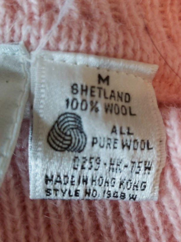 Women's size medium pink turtleneck sweater. Features a Fair Isle pattern. 100% Shetland wool. Cash only.