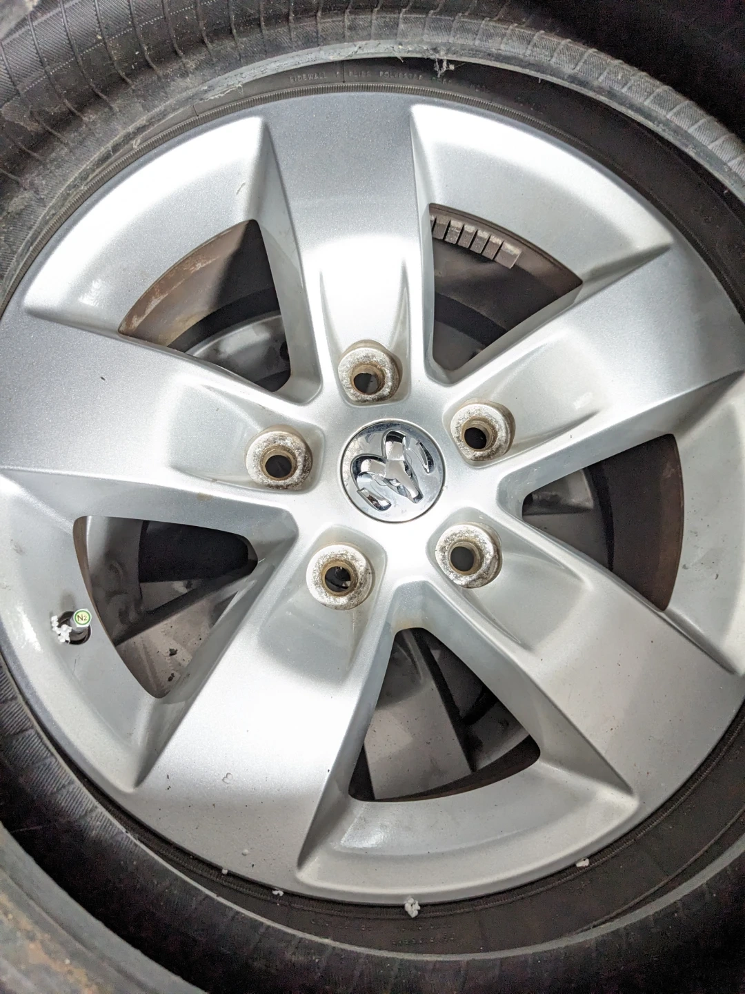 Strong, all-season tires with deep tread and excellent road grip. Very solid and well maintained. Comes with original factory RAM logo rims.