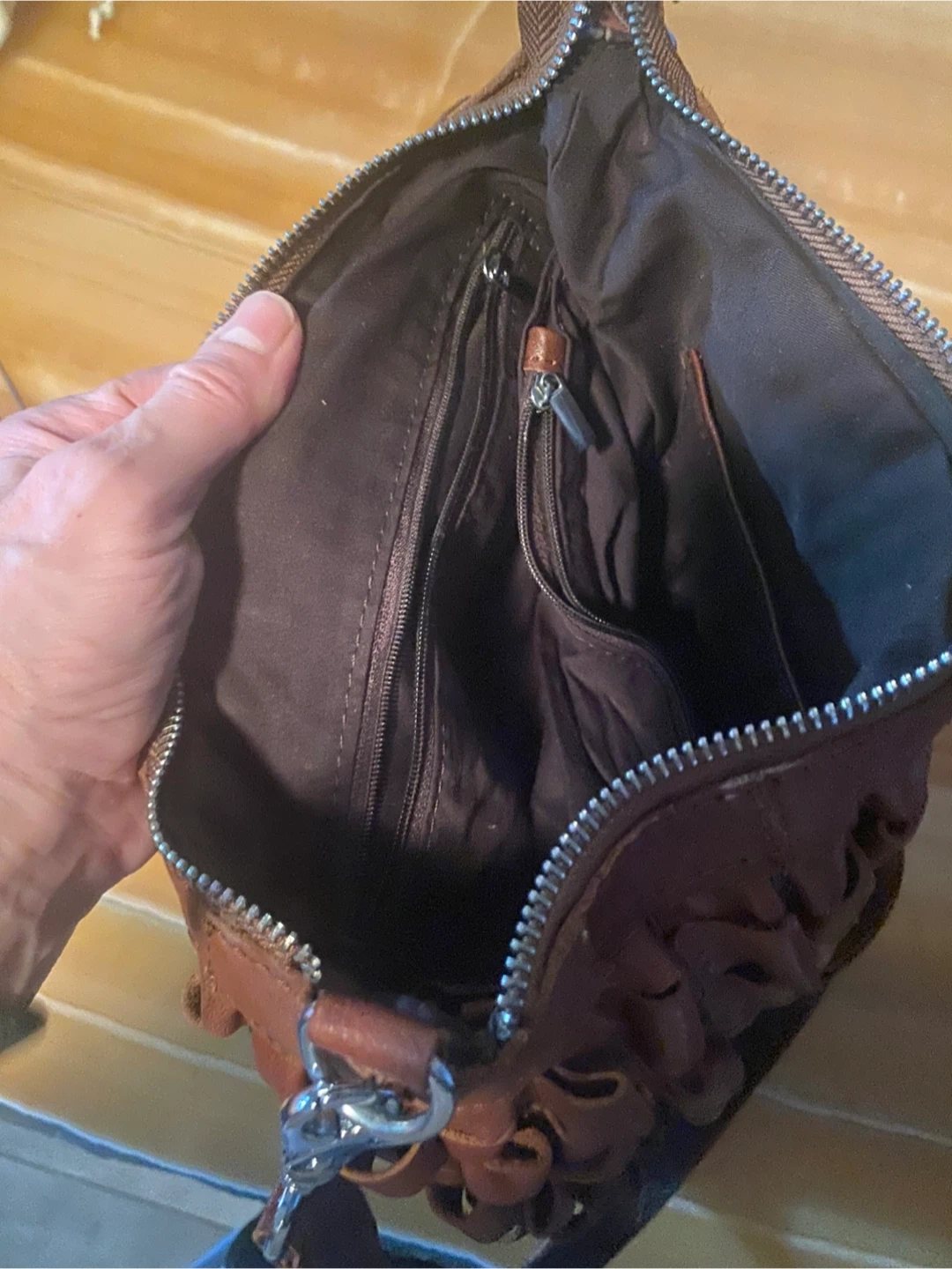 1-Brown custom-made covered in leather loops. Three inside zippers really really well made. Kind of bag that will outlive you. 80 bucks. Was 150$