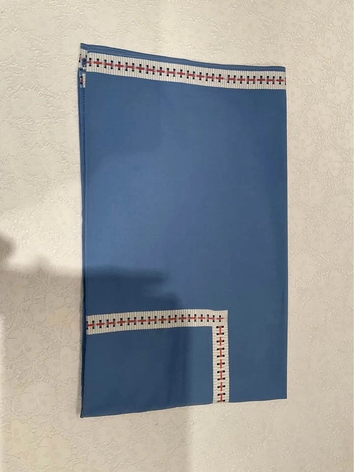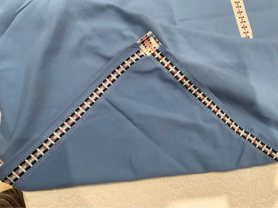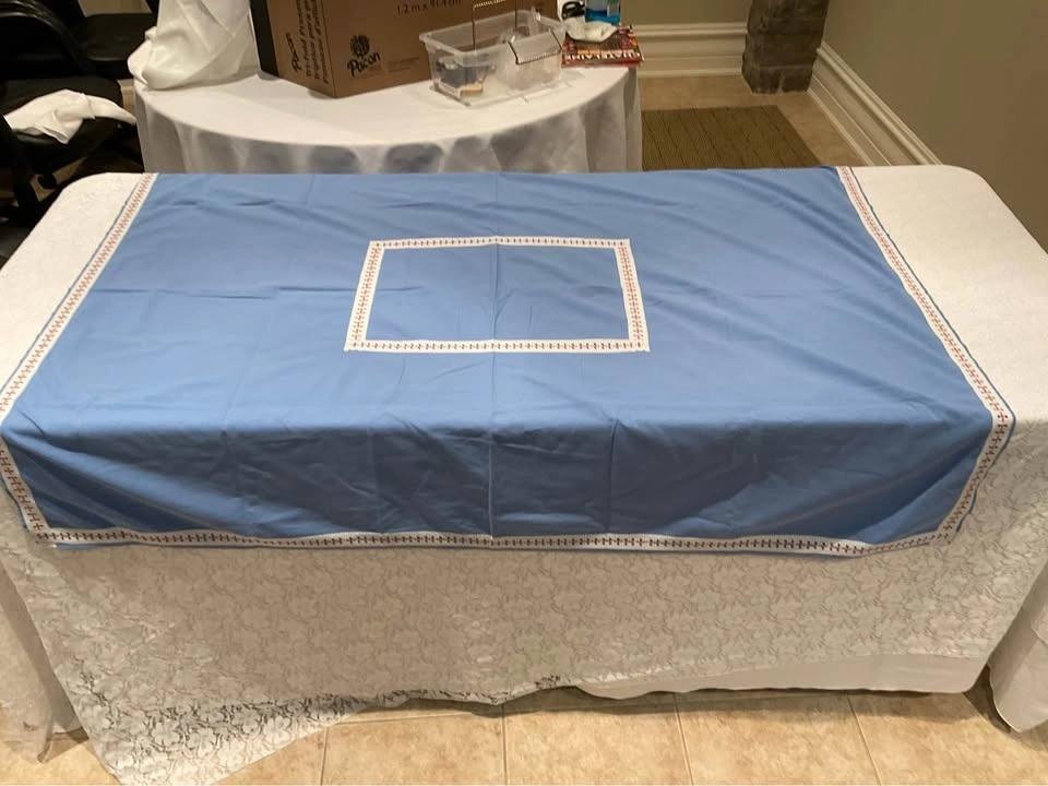 Vintage blue and red check border tablecloth. Very thick good cotton! It is beautiful, they do NOT make them like this anymore! 46 1/2 " x 45 ". Excellent Condition - Smoke & Pet Free Home. Cash Only - Richmond Hill - Bathurst & King Road.