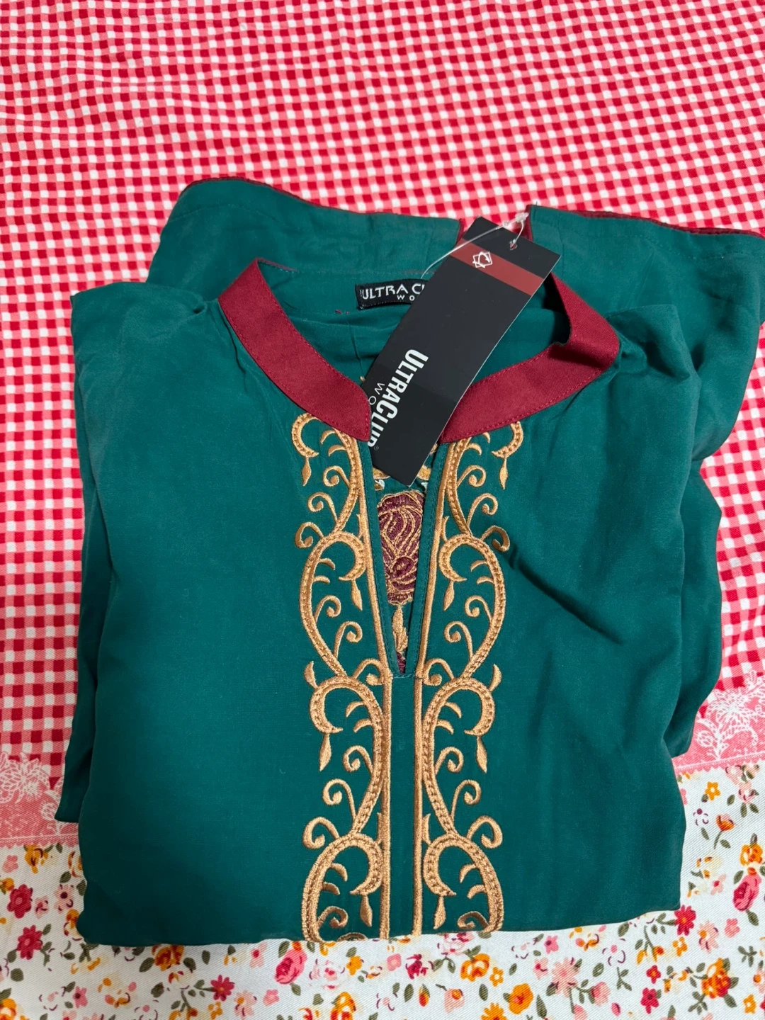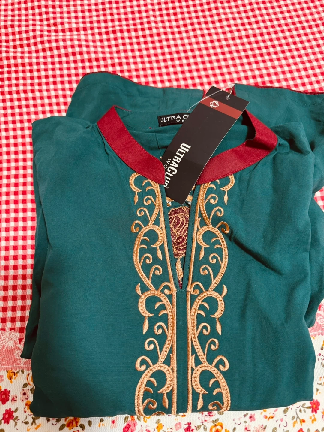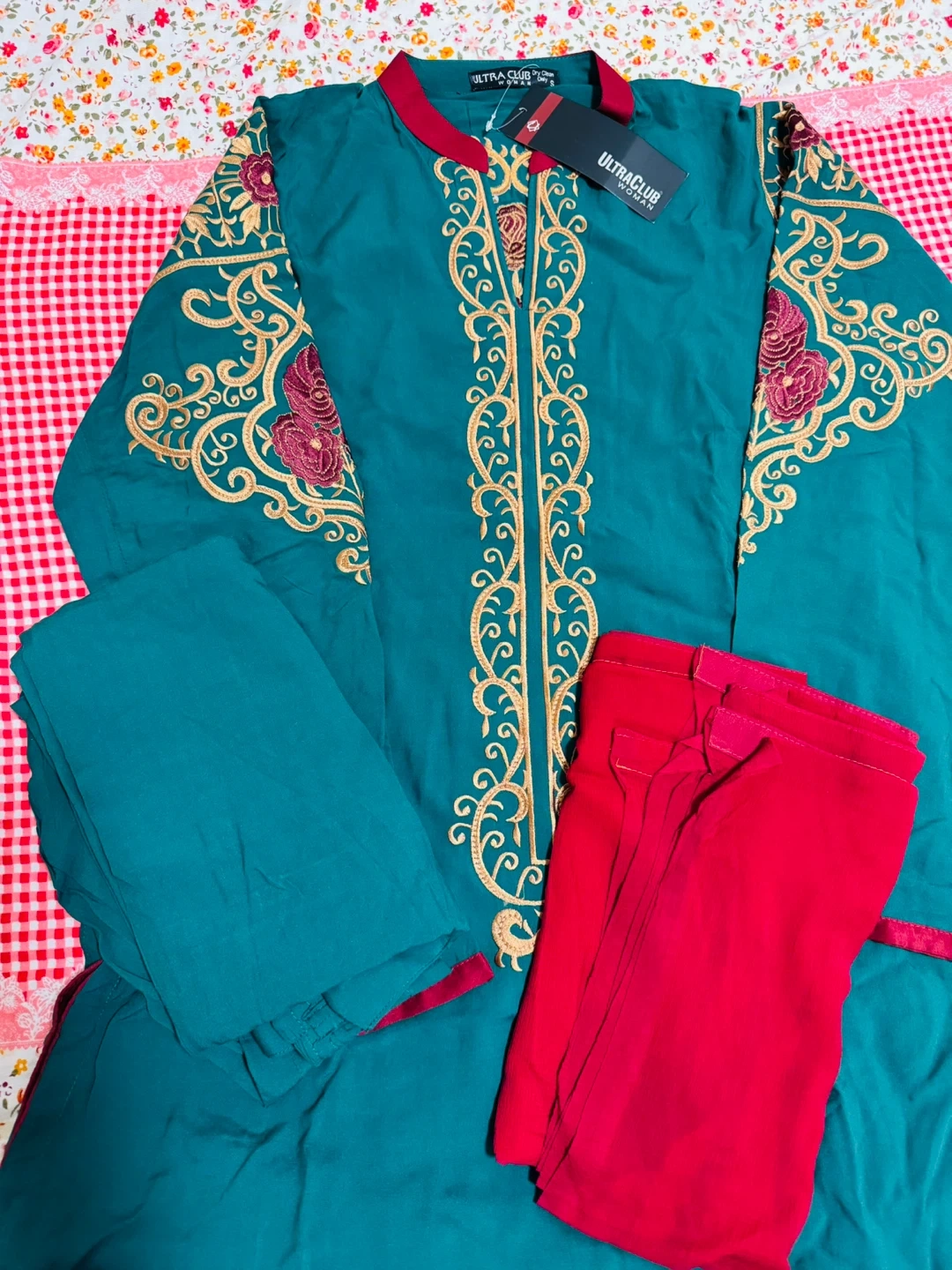 Embroidered teal green kurti by ULTRA CLUB. It has intricate gold and maroon embroidery on the front and sleeves. This kurti features a maroon-trimmed neckline. Available in size medium. It has a very soft dupatta with a pant