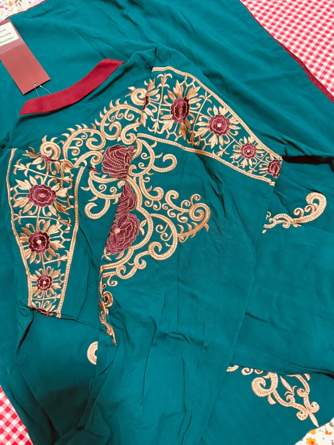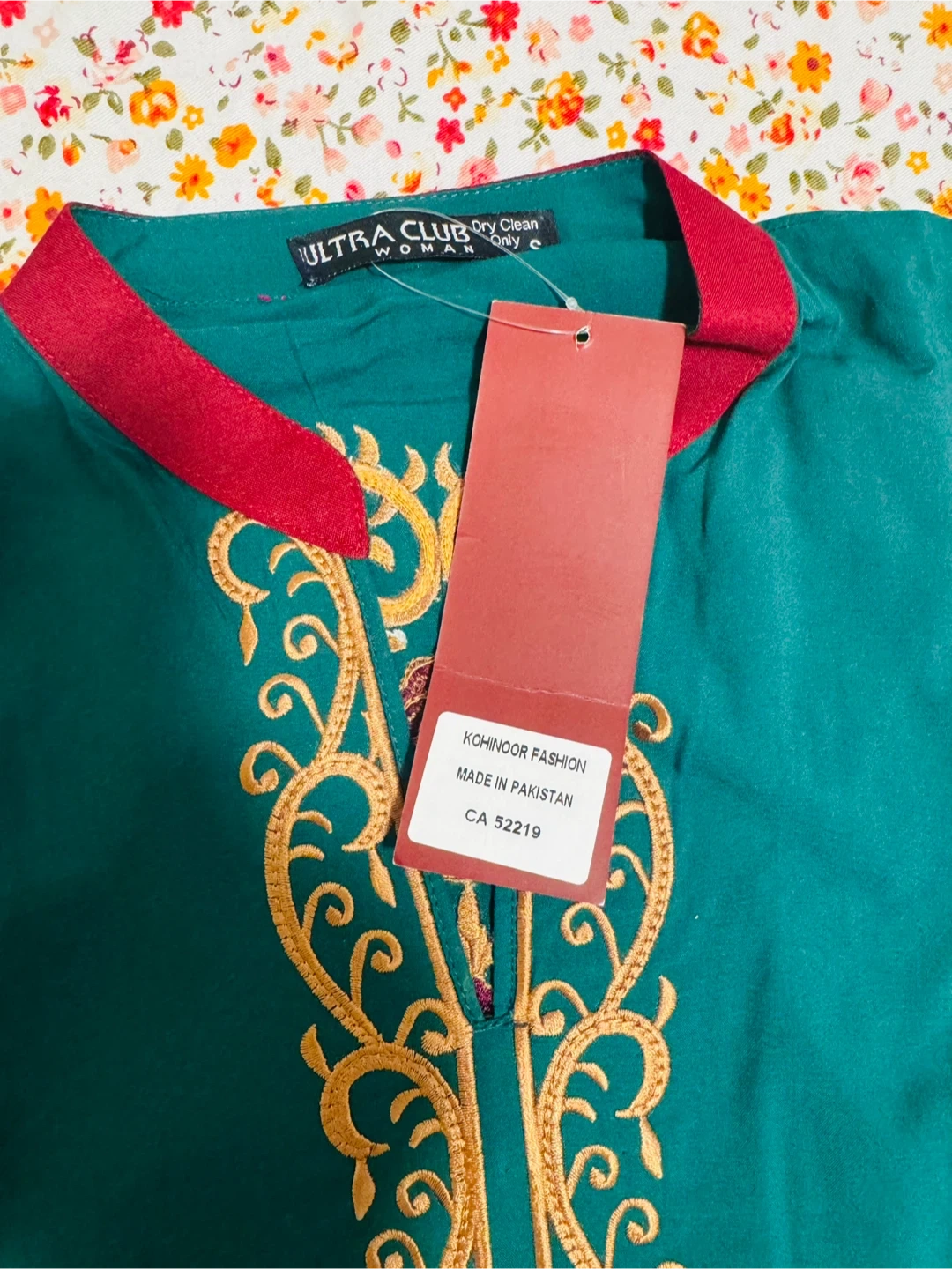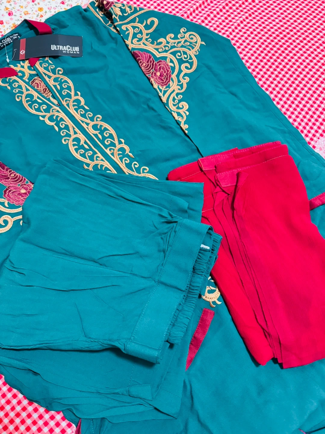 Embroidered teal green kurti by ULTRA CLUB. It has intricate gold and maroon embroidery on the front and sleeves. This kurti features a maroon-trimmed neckline. Available in size medium. It has a very soft dupatta with a pant