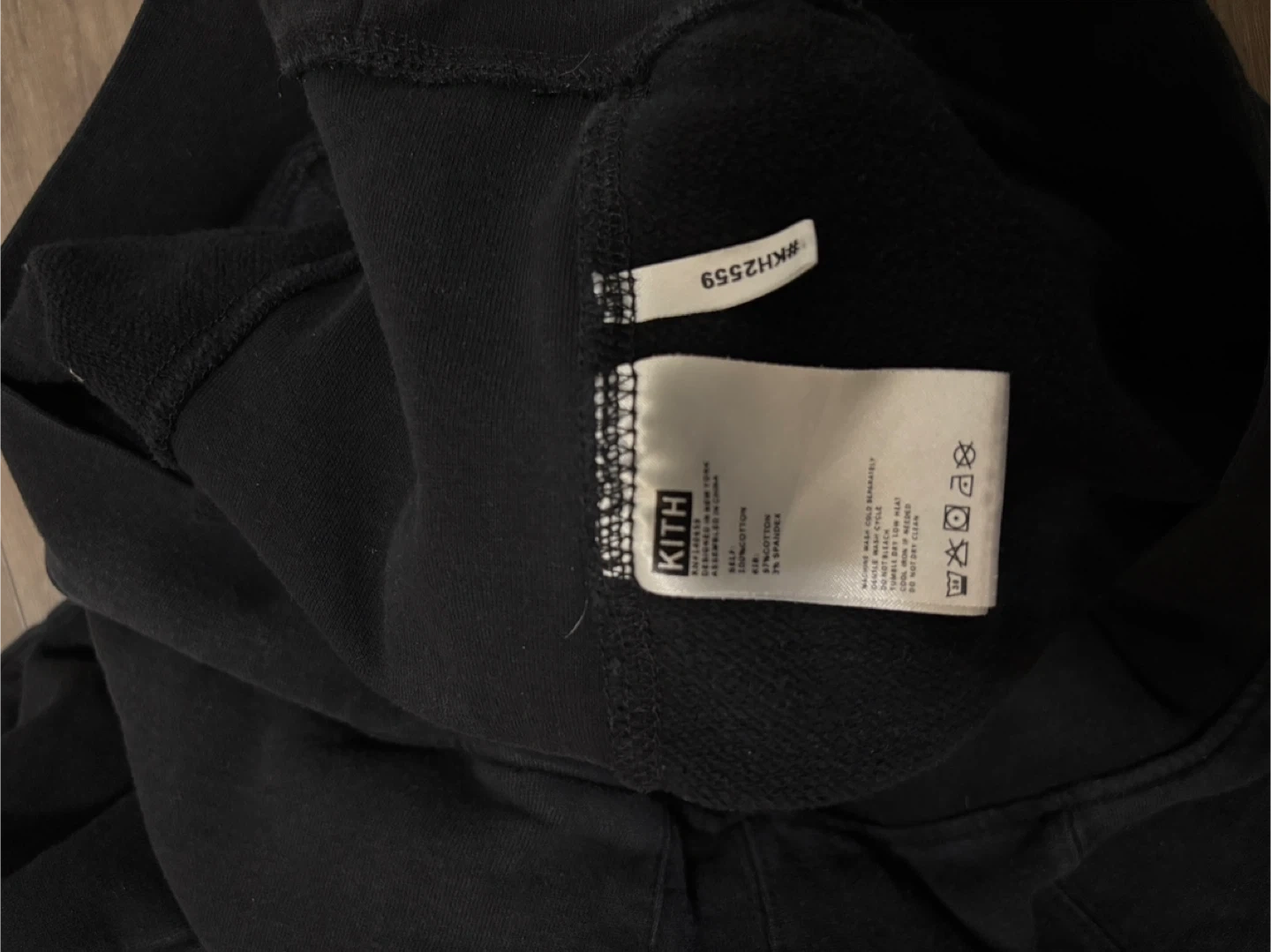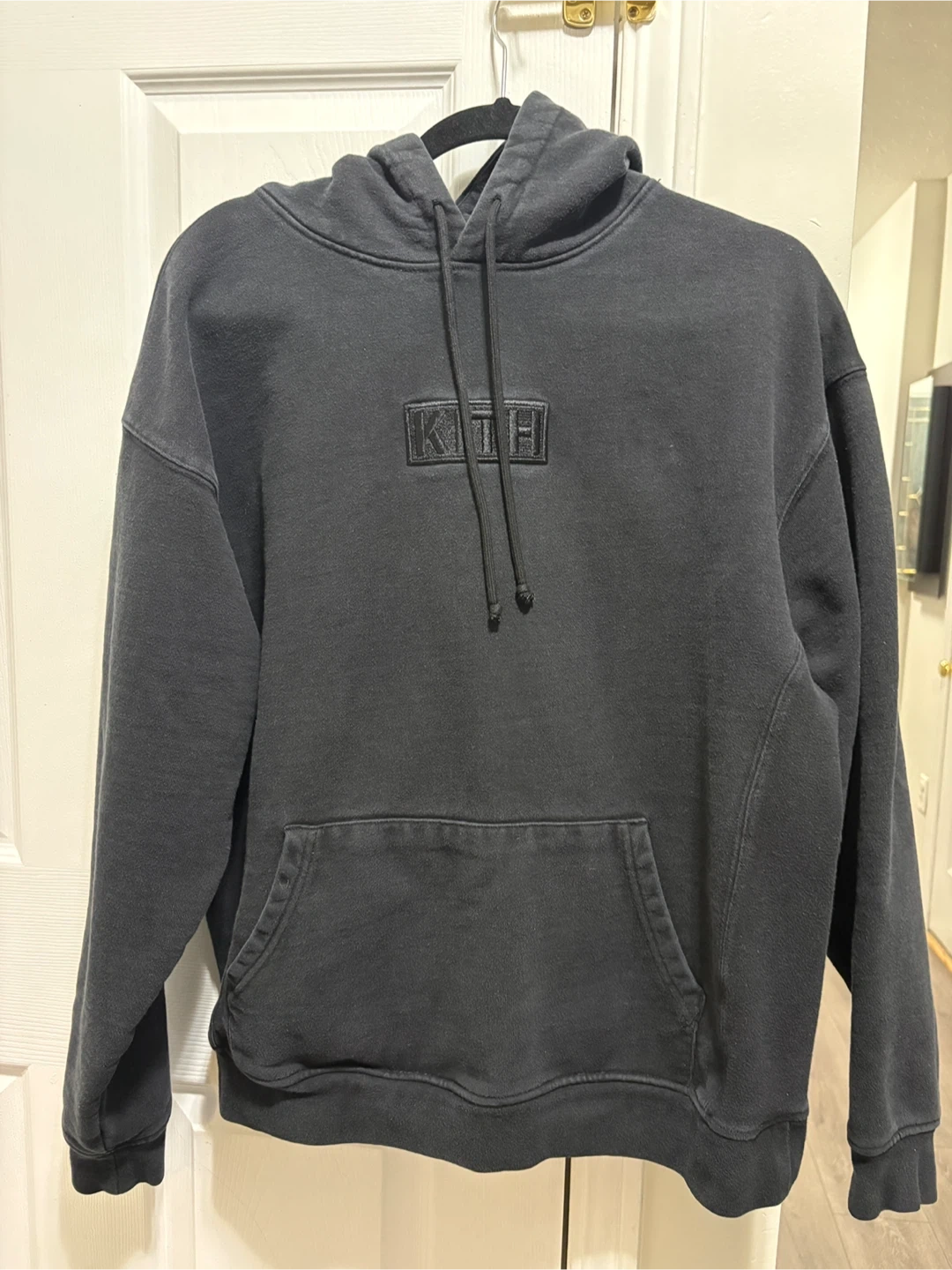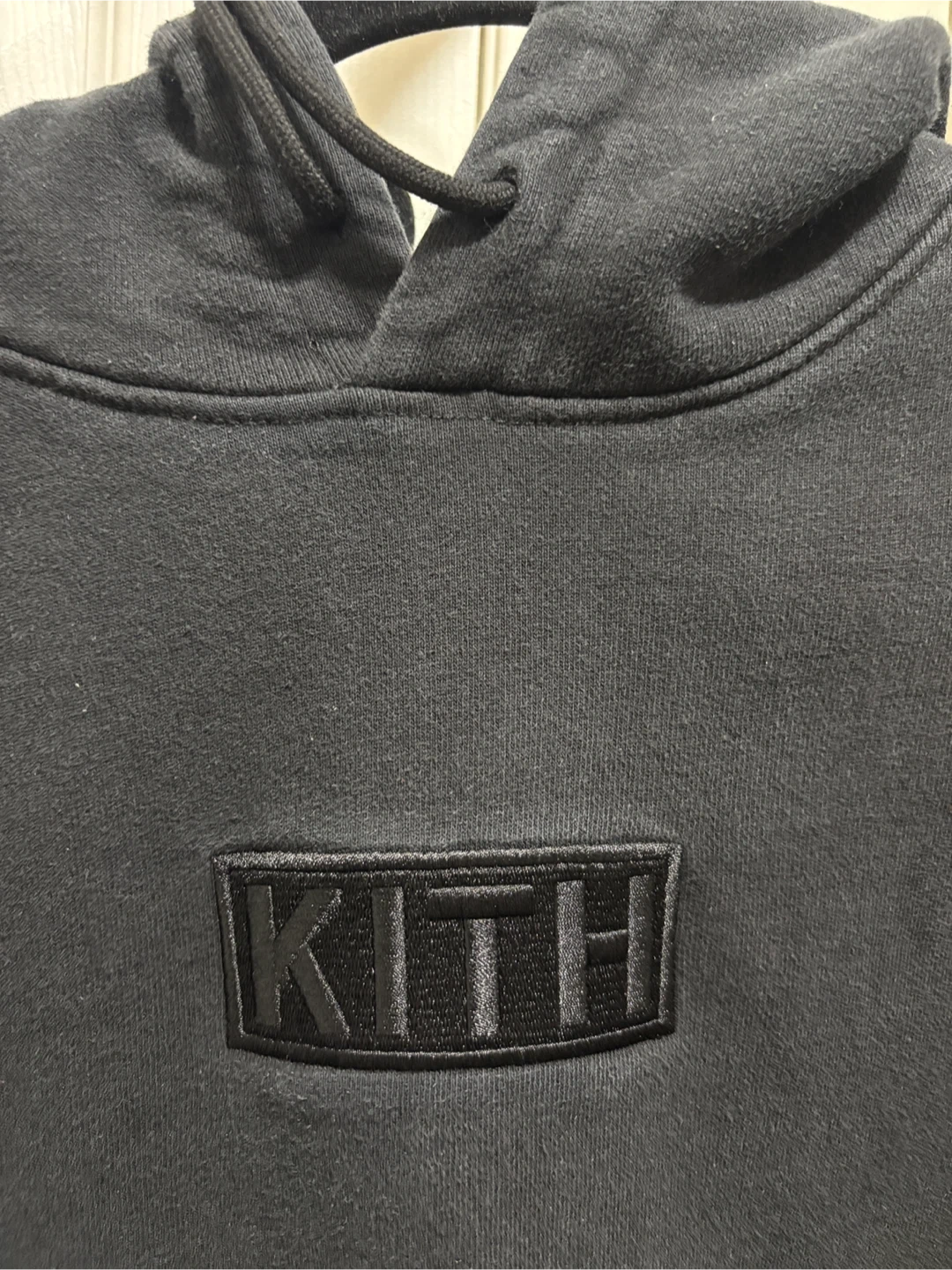 Box logo Distressed Black Kith hoodie. It's a size medium. 70% cotton and 30% polyester blend. Front kangaroo pocket and drawstring hood. Perfect for casual wear!