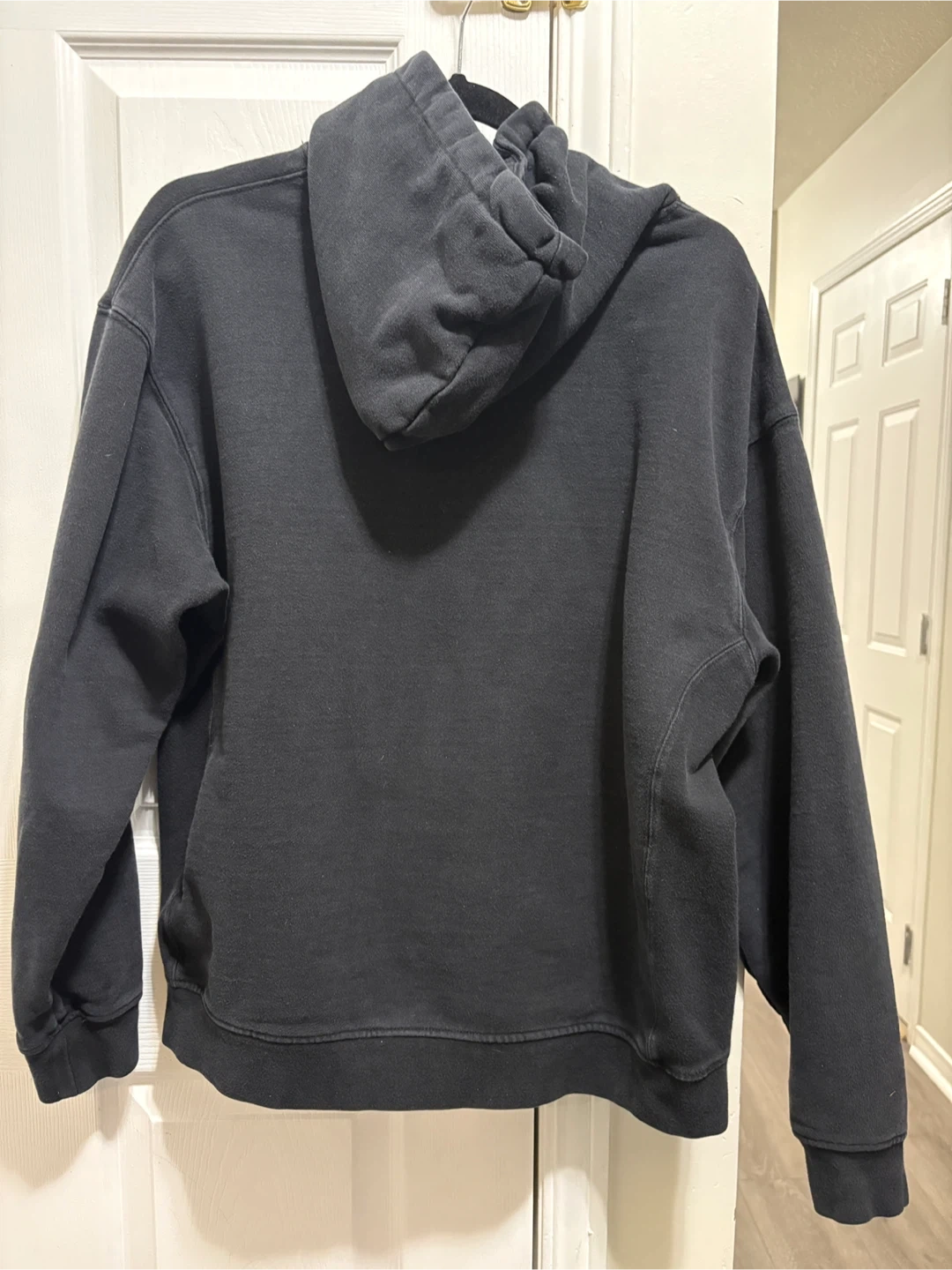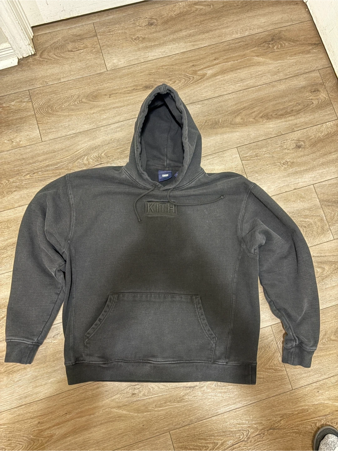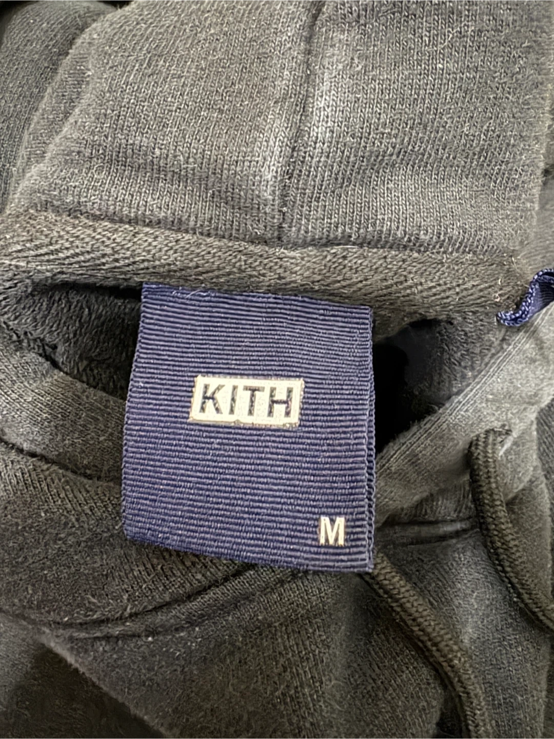 Box logo Distressed Black Kith hoodie. It's a size medium. 70% cotton and 30% polyester blend. Front kangaroo pocket and drawstring hood. Perfect for casual wear!
