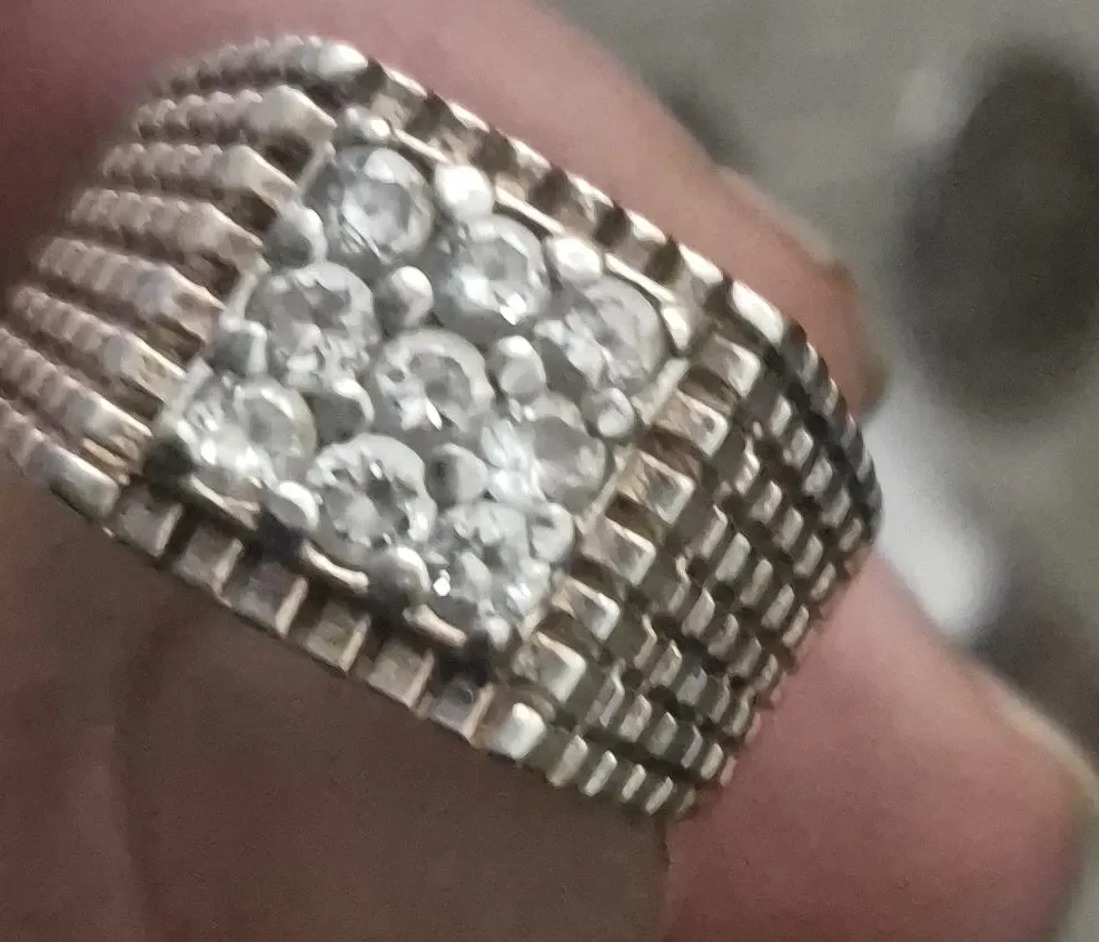 Ring with multiple clear stones set in a textured metal band. The metal appears to be silver-toned. It's a statement piece that adds sparkle to any outfit. This ring would be nice for special occasions.