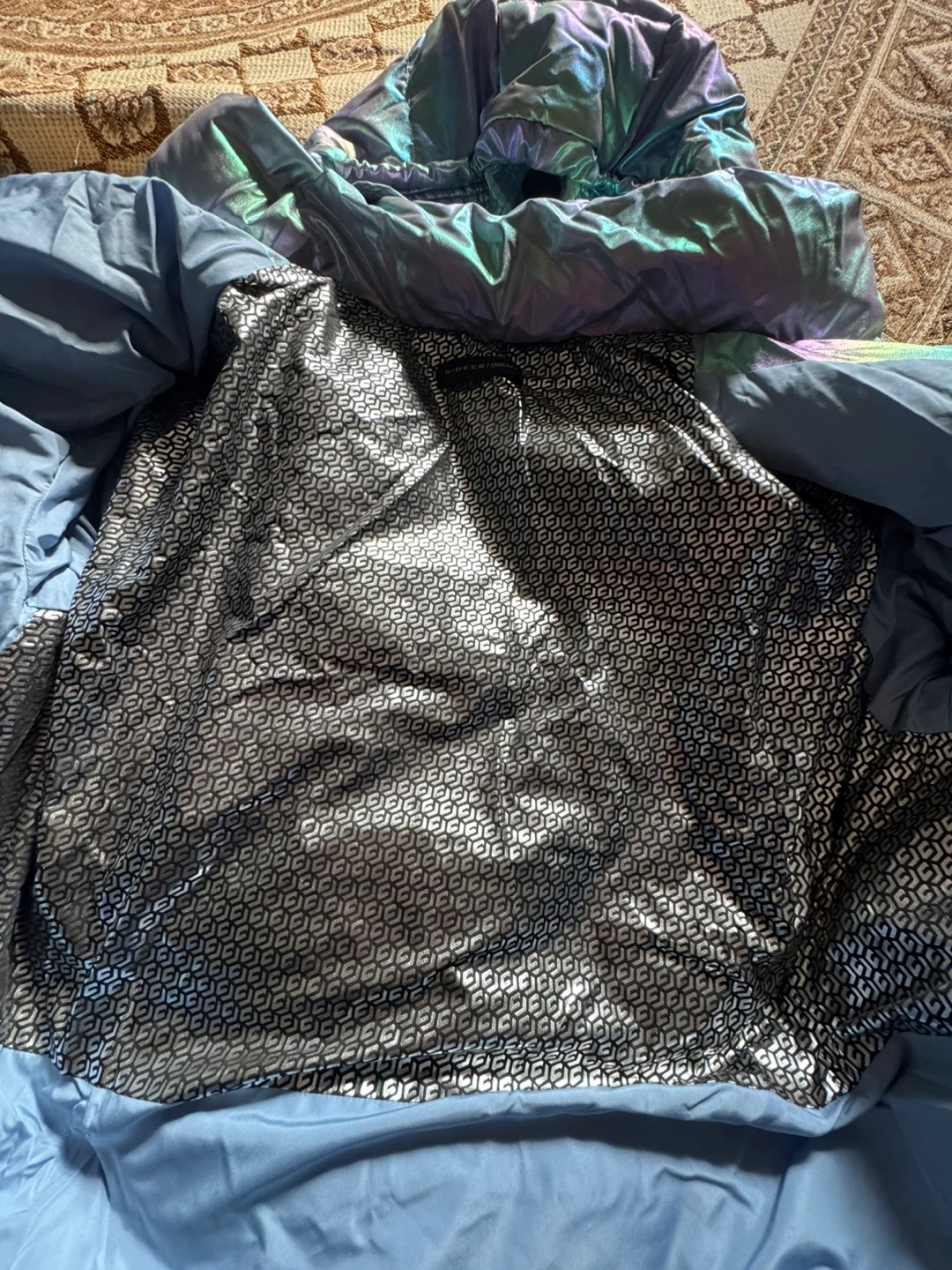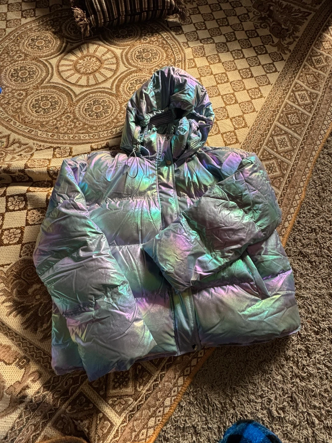This S.DEER CONCEPT puffer jacket is a size XXL. It features a holographic outer shell and a patterned lining. The filler is 85% Grey Goose Down and 15% other down. It's great for staying warm in colder weather!