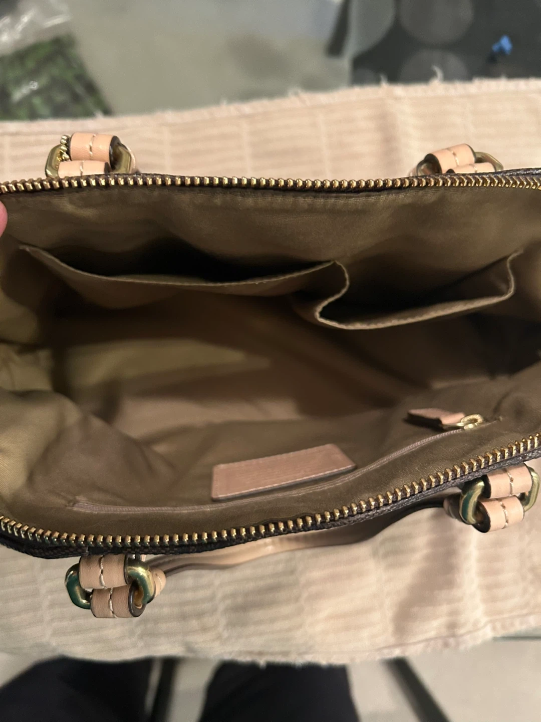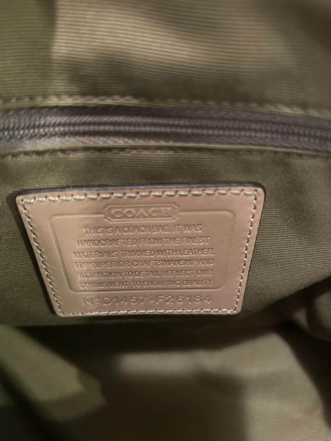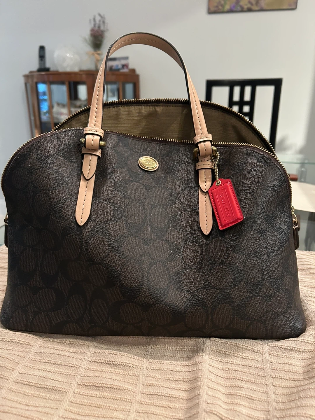 Authentic Coach dome satchel handbag in their signature "C" monogram pattern. It features a zip-top closure with light tan leather trim and handles. The interior has multiple slip pockets for organization. Made from durable coated canvas and leather.