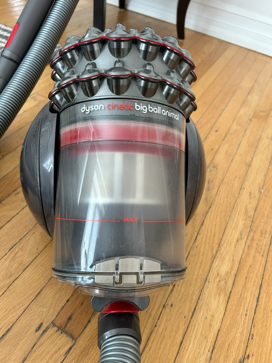 This is a Dyson Cinetic Big Ball Animal vacuum. It's grey and red. It comes with a remote control. Perfect for cleaning. Additional tools included & Cold & Hot w/remote control Vent.