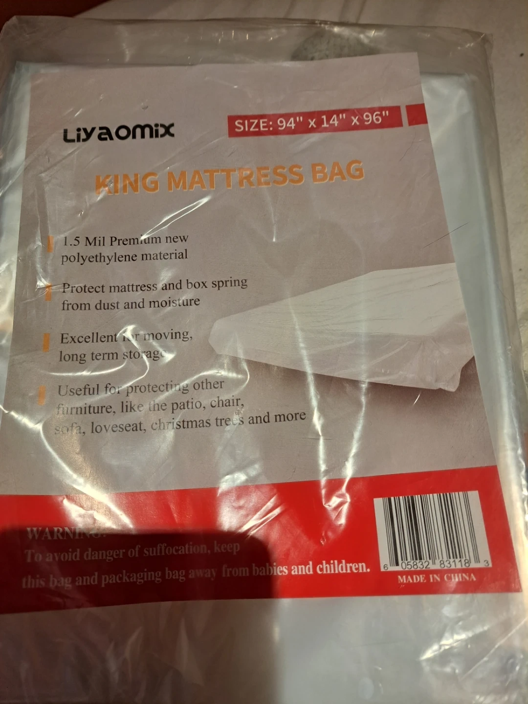 This is a Liyaomix King mattress bag, measuring 94" by 14" by 96". It's made from 1.5 mil premium new polyethylene material to protect against dust and moisture. Useful for moving, long-term storage, or protecting other furniture and items.