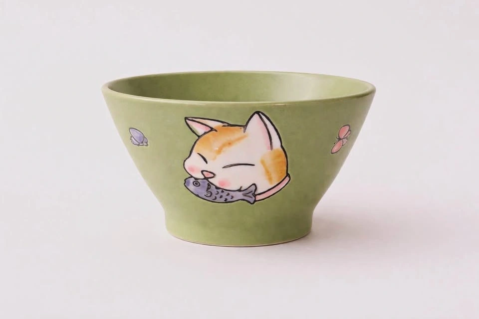 Add a touch of charm to your everyday meals with this adorable hand-painted ceramic noodle bowl. Finished in a soft sage green glaze, the bowl features a sweet cat illustration holding a fish, accented with delicate pastel details around the rim. Its gently flared shape makes it perfect for noodles, ramen, rice bowls, soups, or even snacks. Each piece has a cozy, playful feel that’s perfect for cat lovers and handmade pottery enthusiasts alike.