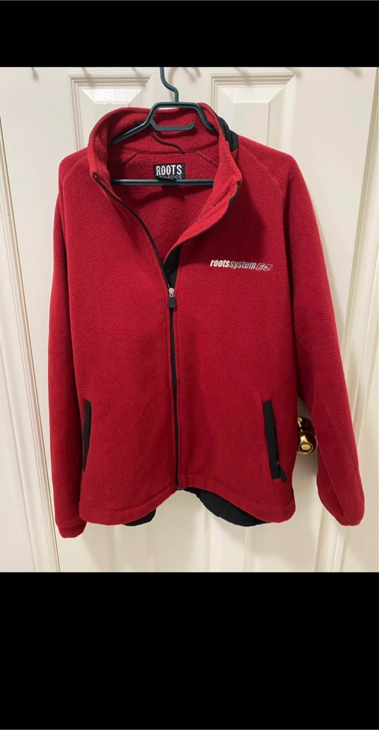 This red fleece jacket from Roots is a cozy mid-layer. It features a full zip front and a black collar. Made from soft fleece material.