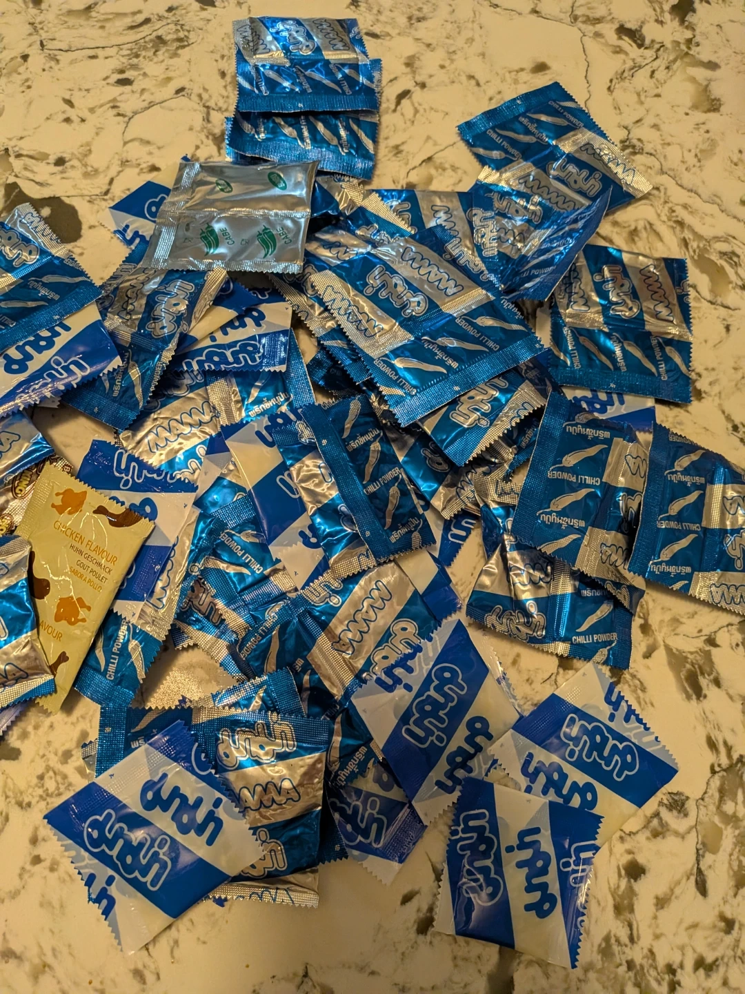 A bulk lot of MAMA brand chili powder seasoning packets. These are individual servings for noodle dishes or other cooking. Many are for chili powder, with a few chicken flavour ones included.