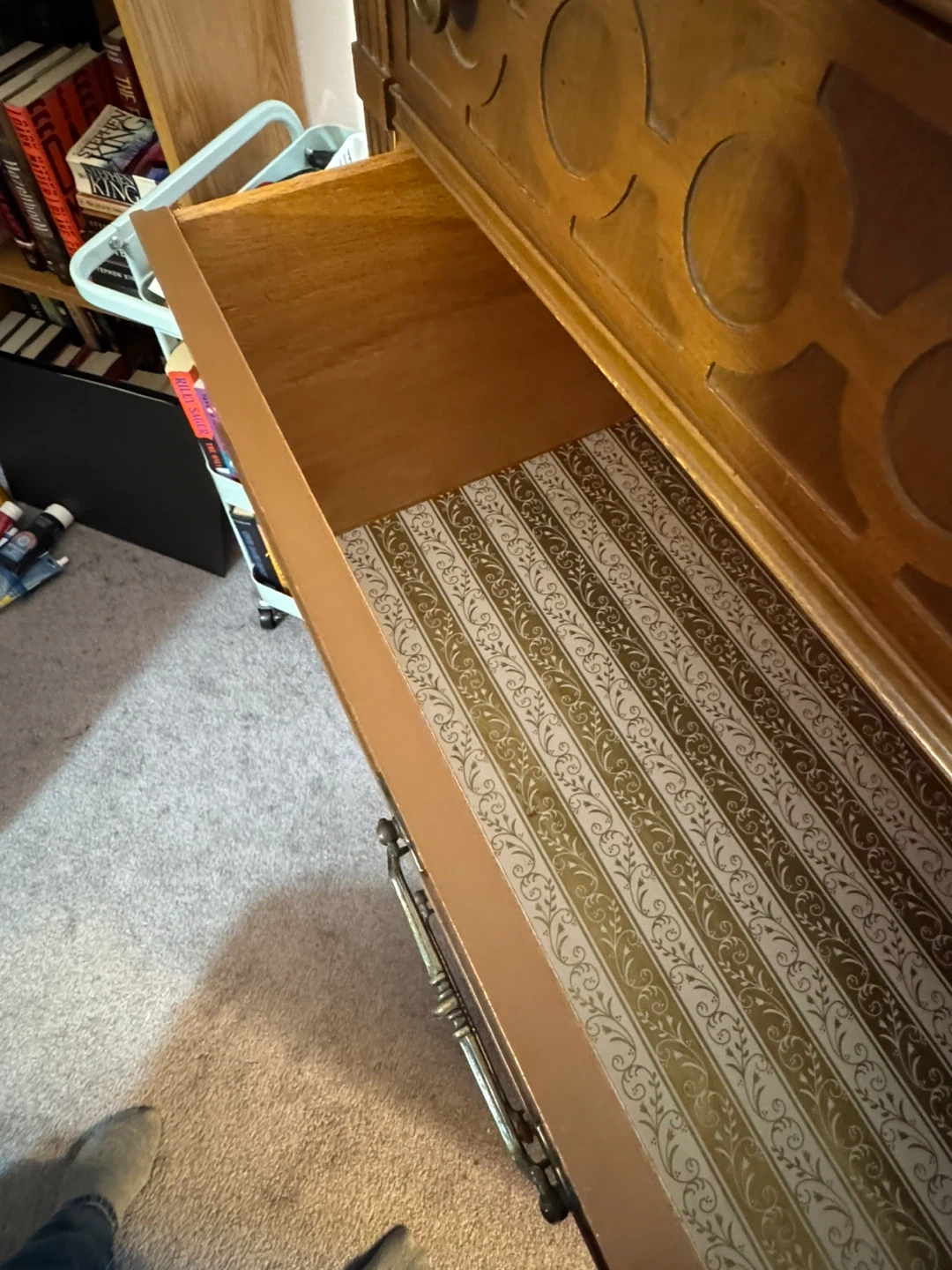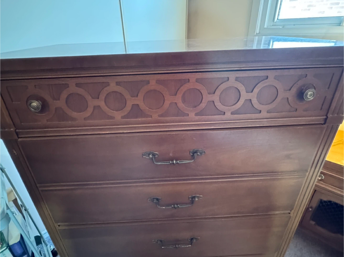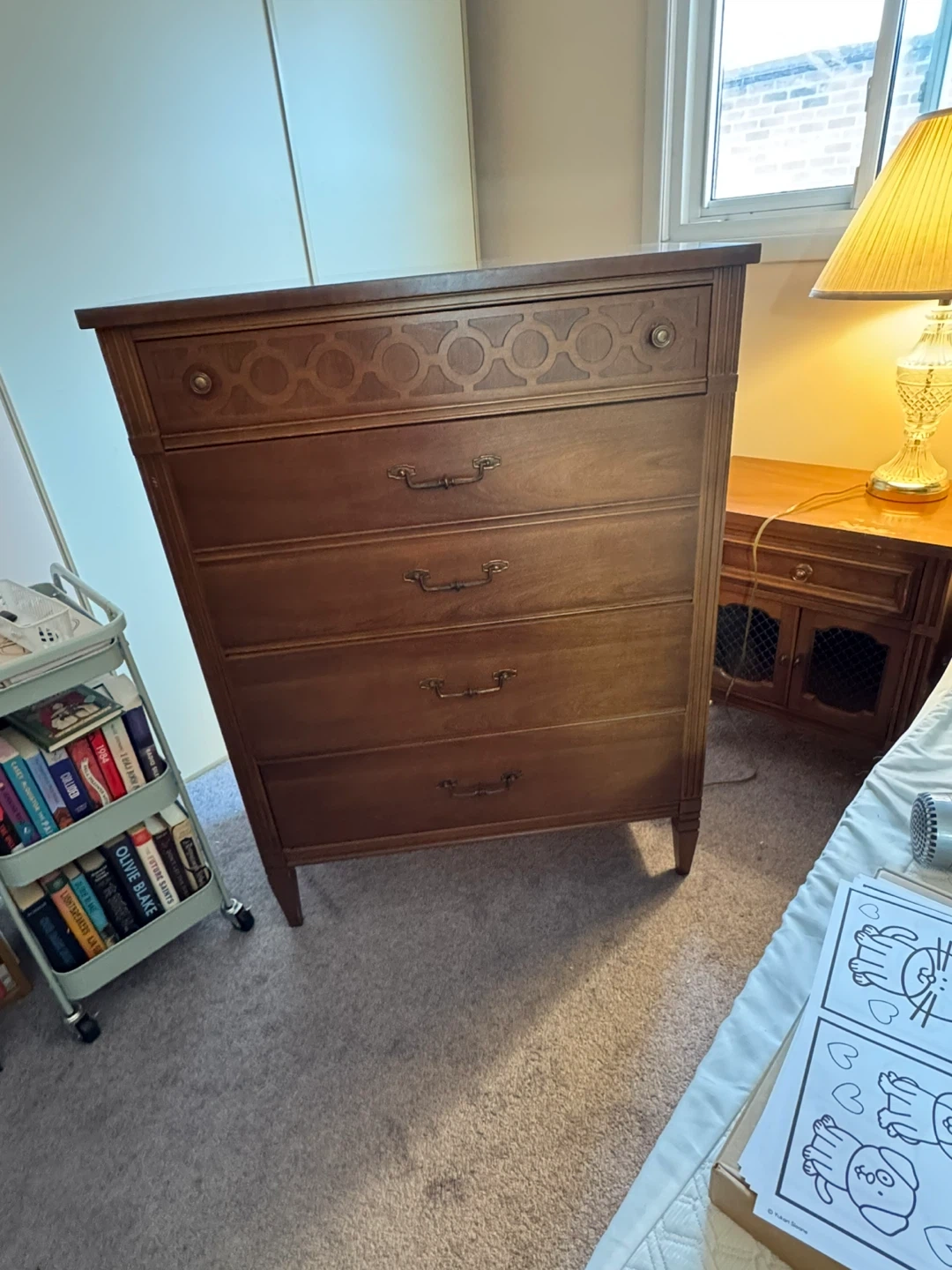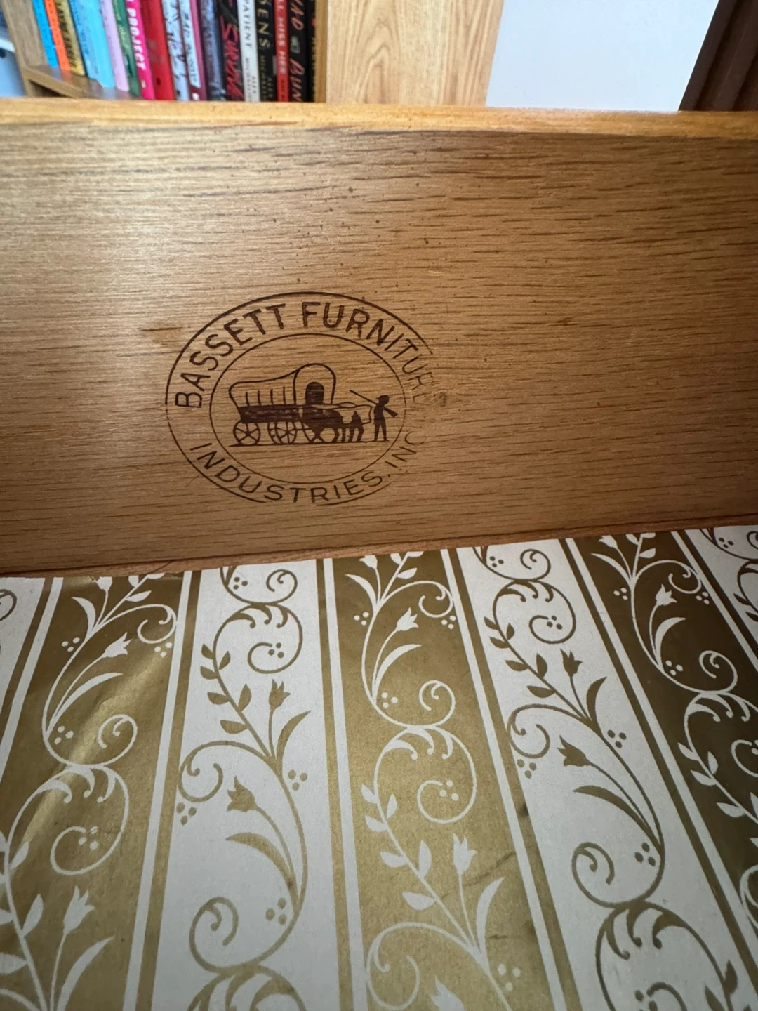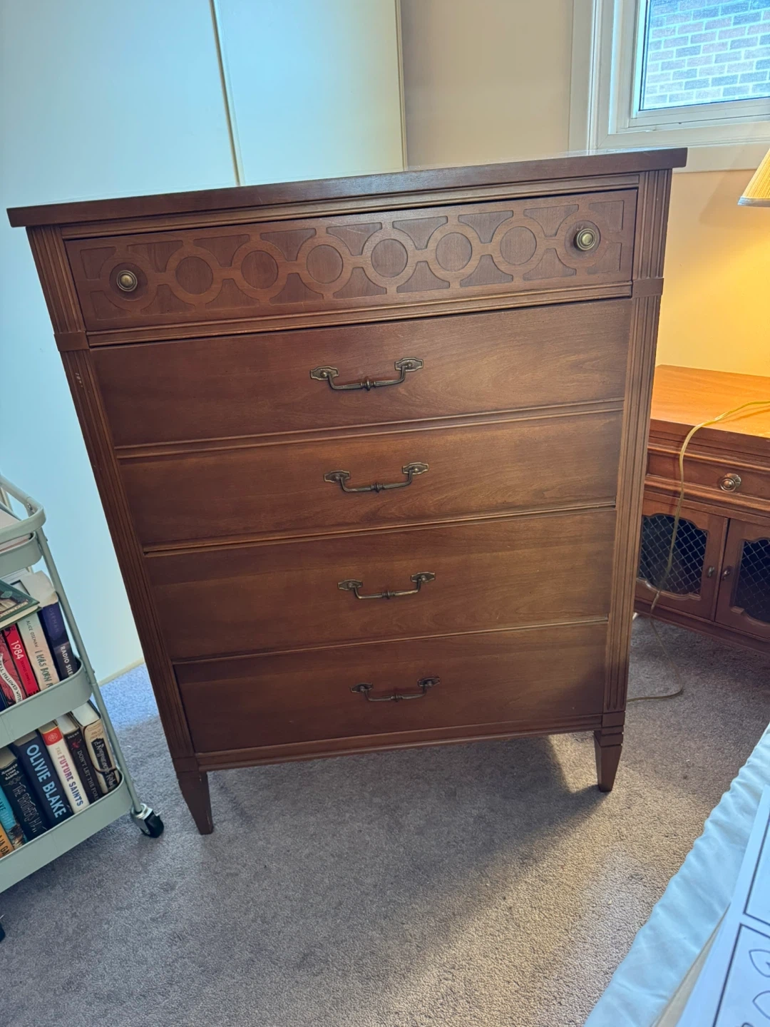 This is a vintage Bassett Furniture Industries dresser with five drawers. It's made of solid wood with decorative detailing on the top drawer. This piece would be useful for storing clothes or linens.