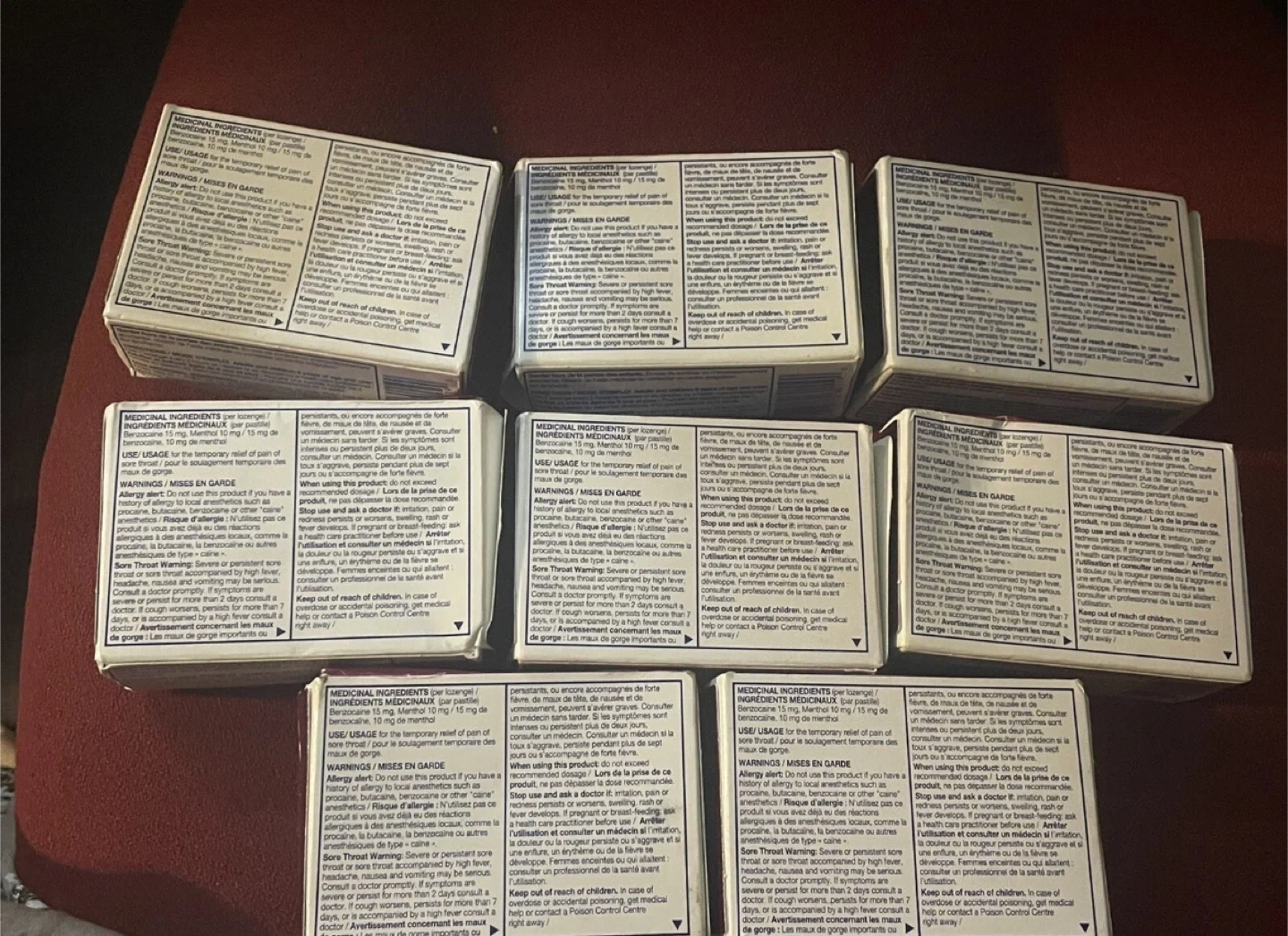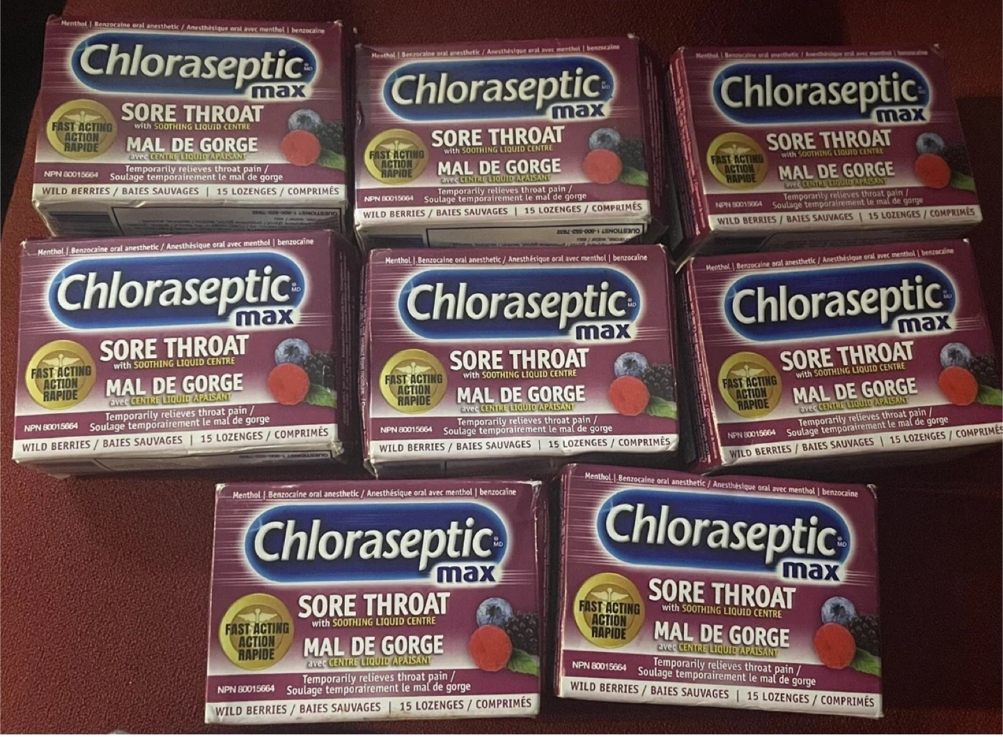 Nine boxes of Chloraseptic Max sore throat lozenges in Wild Berries flavour. Each box contains 15 lozenges for a total of 135 lozenges. They offer fast-acting relief for throat pain and sore throats. Expiration dates are November 2026