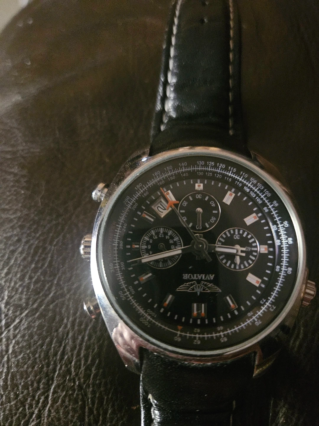 Selling an Aviator watch, model AVW5839G1. It has a black face and a leather band. The back of the watch indicates it is water resistant and made of stainless steel