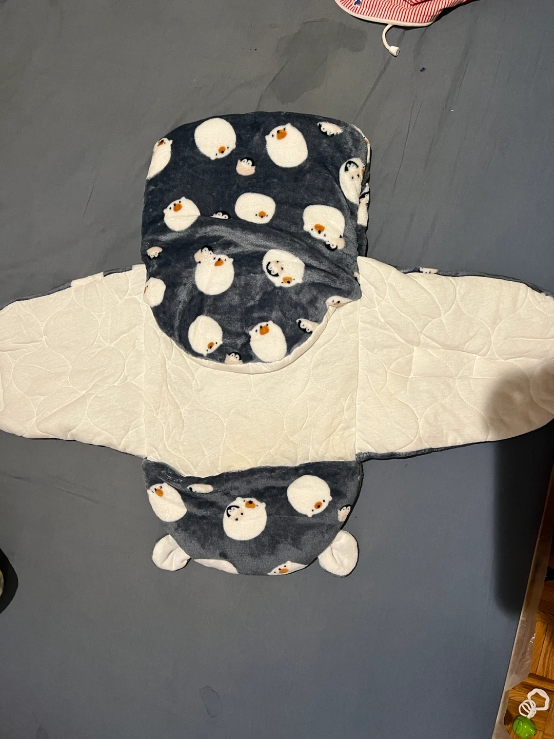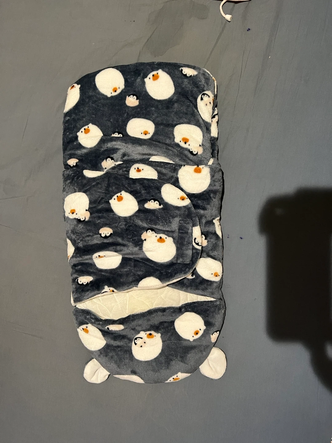 Cozy plush swaddle sleep sack with a cute penguin design. Features a wrap-around closure for a snug fit. Soft, warm material for baby's comfort.
