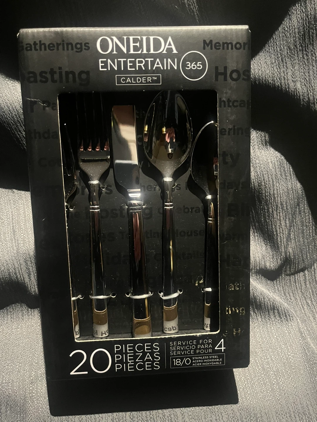 Another great mystery box. Fine price to sell! This 20-piece flatware set serves four people. It's made of 18/0 stainless steel and is dishwasher safe. It includes 4 dinner forks, 4 dinner knives, 4 dinner spoons, and 4 teaspoons.