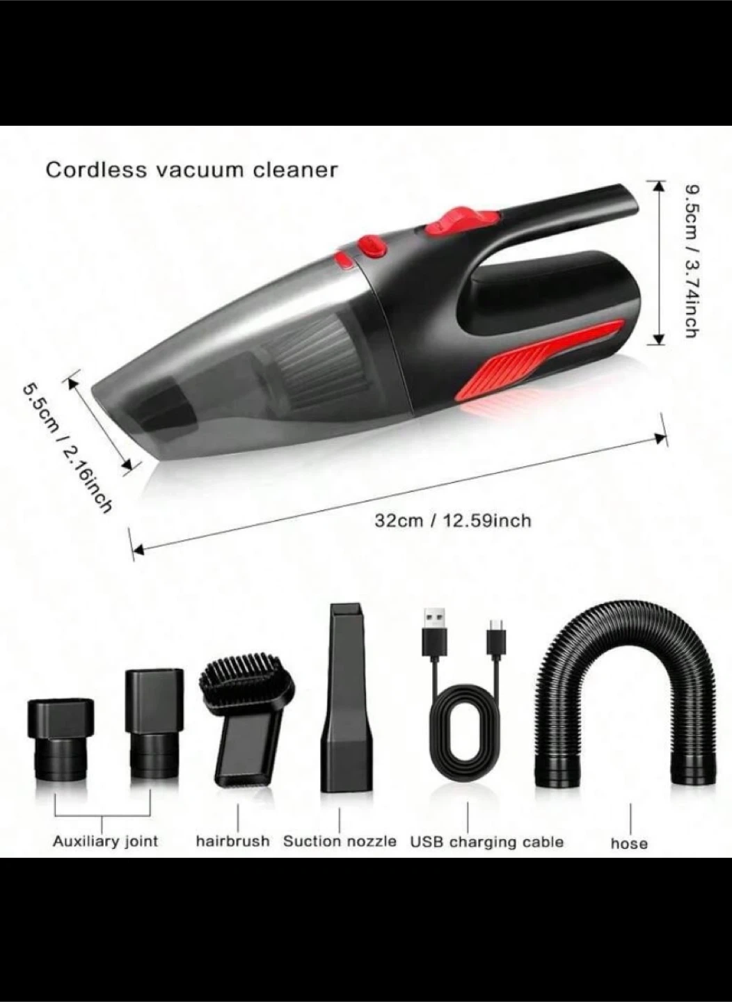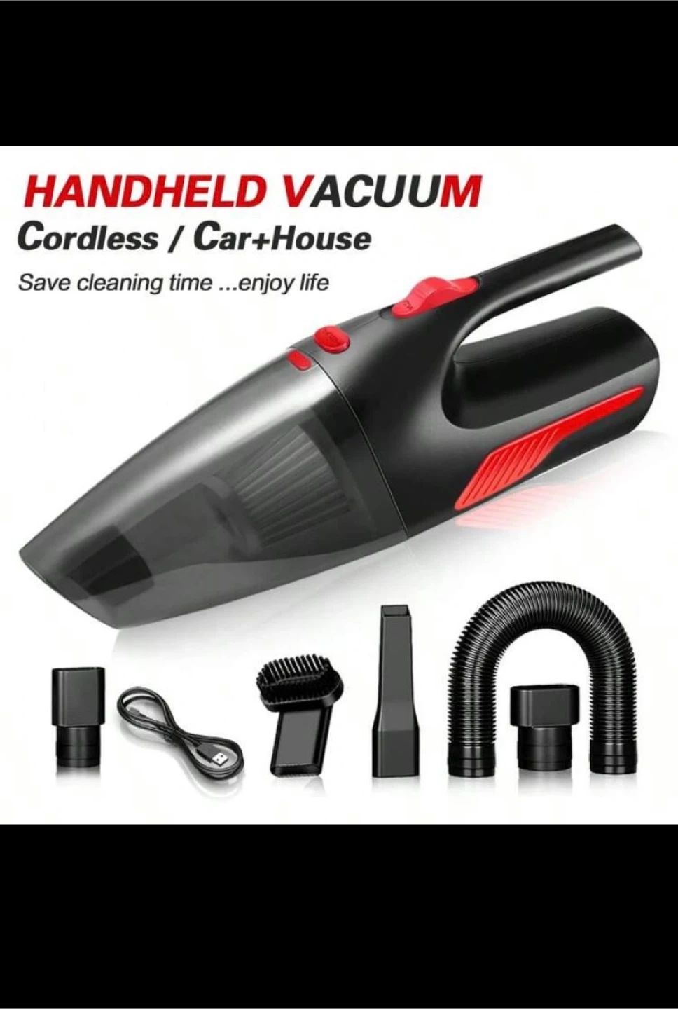 This cordless vacuum cleaner is great for cars and homes. It comes with multiple attachments including a crevice nozzle, a brush, and a hose. It's powered by a rechargeable battery and includes a USB charging cable.