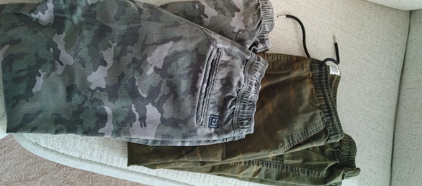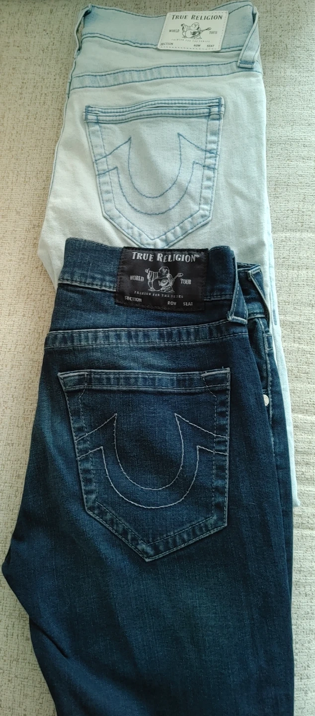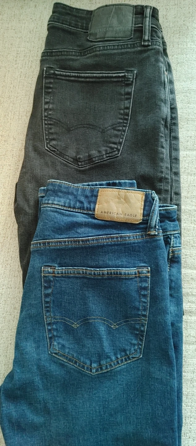 Includes two pairs of American Eagle jeans, one in dark wash and one in black. Also features two pairs of True Religion jeans, one in a light wash and one in a dark wash. Two pairs of camouflage cargo pants are also included. Cotton blend materials.