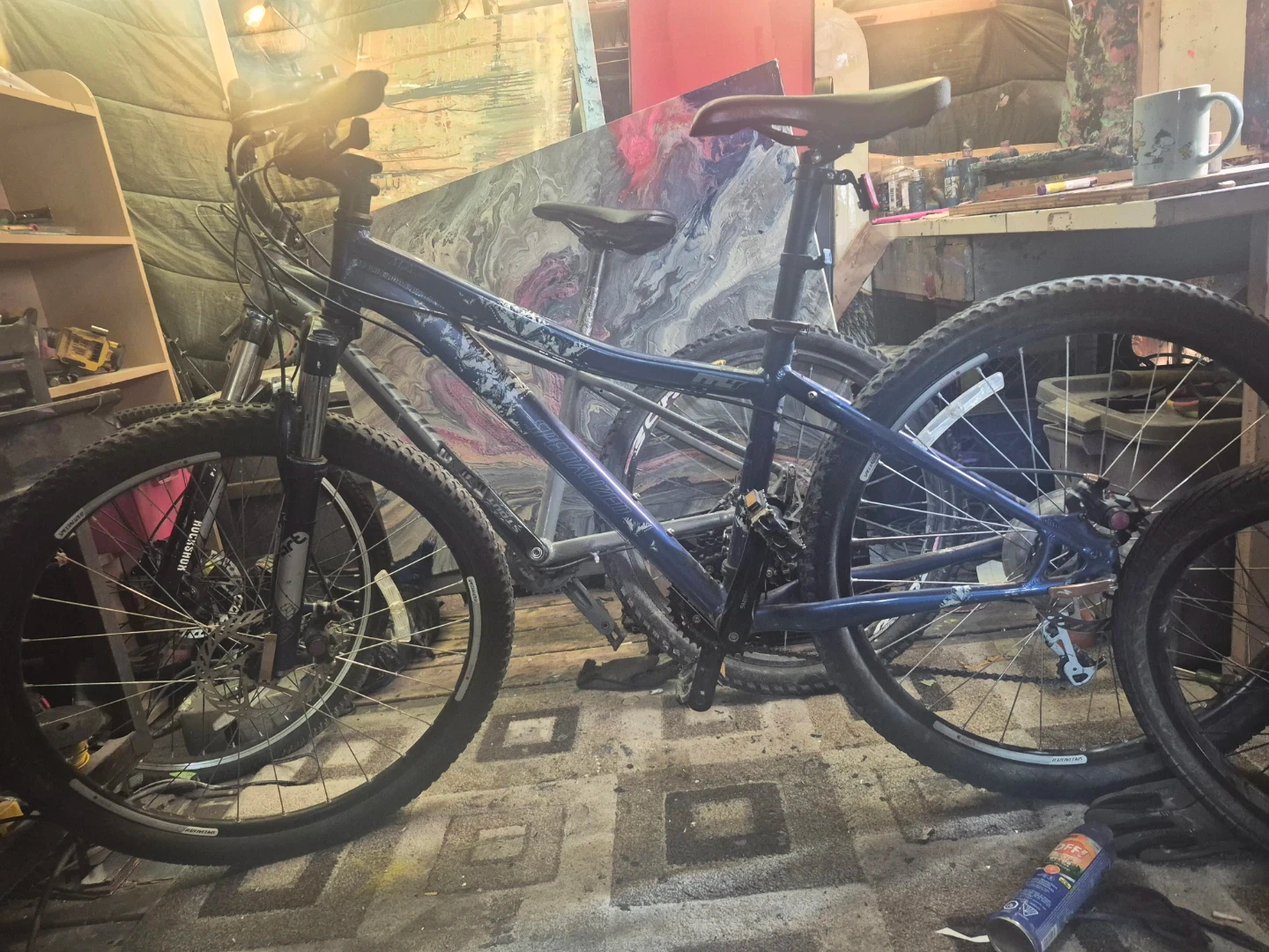 This is a blue Specialized MY4 mountain bike. It has disc brakes and knobby tires, great for trails. It's a durable bike ready for adventure!